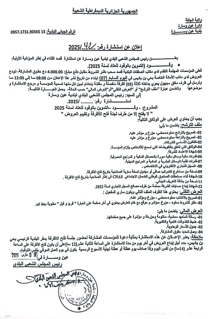 آخر الإعلانات:اعلان عن منح تصحيحي رقم 19/25 لفائدة المؤسسة العمومية الاستشفائيةاعلان عن استشارة رقم 29/32/33/34/35 لفائدة مديرية الحماية المدنيةاعلان عن طلب عروض لفائدة مديرية التعمير و التجهيزات العمومية و البناءاعلان عن طلب عروض لفائدة ديوان الترقية و التسيير العقارياعذار لفائدة مديرية التجهيزات العموميةاعذار ثاني لمقاولة اشغال البناء دحمان محمد لفائدة ديوان الترقية و التسيير العقارياعلان عن استشارة استعجالية لفائدة بلدية المليليحةاعلان عن المنح المؤقت لفائدة المؤسسة العمومية الاستشفائية بالادريسيةاعلان عن عدم جدوى طلب العروض لفائدة مديرية السياحة و الصناعة التقليديةاعلان عن الغاء المنح المؤقت لفائدة بلدية الجلفةاعلان عن طلب عروض للمرة الثانية لفائدة مديرية السكناعلان عن المنح المؤقت لفائدة بلدية عمورةاعلان عن استشارة رقم 17/2025 لفائدة بلدية عمورةاعلان عن عدم جدوى لفائدة محافظة الغاباتاعلان عن استشارة 118/25 و تمديد استشارة 119/25 لفائدة مديرية التجهيزات العموميةاعلان عن الاستشارة رقم 13/25 لفائدة ديوان الترقية و التسيير العقارياعذار 01 لفائدة مديرية الاشغال العموميةاعذار اول لفائدة ديوان الترقية و التسيير العقارياعلان عن استشارة بعد عدم جدوى لفائدة مديرية المجاهدينمنح مؤقت لفائدة مديرية التربيةاعلان عن عدم جدوى بلدية مسعداعلان عن استشارة بعد عدم الجدوى02/25 لفائدة مديرية المجاهديناعلان عن المنح المؤقت لفائدة مديرية المصالح الفلاحيةاعلان عن الغاء منح مؤقت لفائدة مديرية التعمير و الهندسة المعمارية و البناءاعلان عن اعذار 02 لفائدة بلدية حاسي بحبحاعلان عن طلب العروض لفائدة مديرية السكن لولاية الجلفةاعذار لفائدة مديرية المصالح الفلاحيةاعلان عن المنح المؤقت لفائدة التجهيزات العموميةاعلان عن المنح المؤقت لفائدة مديرية التعمير و الهندسة المعمارية و البناءاعلان عن المنح المؤقت لفائدة المصالح الفلاحيةاعلان عن الغاء المنح المؤقتاعلان عن جدوى رقم 01/25 لفائدة مديرية الضرائباعذار 01 لفائدة بلدية دار الشيوخاعلان عن استشارة 116-117/25 لفائدة مديرية التجهيزات العموميةاعلان عن المنح المؤقت لفائدة مديرية التعمير و الهندسة المعماريةاعلان عن طلب عروض لفائدة بلدية عين وسارة من أجل التحسين الحضرياعلان عن طلب عروض من اجل اقتناء عتاد طبي لفائدة مستشفى الام و الطفلاعلان عن طلب العروض لفائدة مديرية الادارة المحليةاعلان عن طلب عروض لفائدة مديرية التجهيزات العموميةاعلان عن توظيف لفائدة المؤسسة العمومية الاستشفائية بقطارةاعلان لفائدة مديرية البيئةاعلان عن الغاء المنح المؤقت لفائدة مديرية الثقافة و الفنوناعلان عن الغاء المنح المؤقت لفائدة مديرية الصحة و السكاناعلان عن الغاء تعديل منح مؤقت لفائدة مديرية الاشغال العموميةاعلان عن استشارة رقم 139/25 لفائدة بلدية عين وسارةاعلان عن استشارة 01/25 لفائدة مديرية السلكية و اللاسلكيةاعلان عن المنح المؤقت لفائدة مديرية التعمير و الهندسة المعمارية و البناءاعلان عن عدم جدوى لفائدة مديرية الادارة المحلية بخصوص اقتناء و تركيب موزع هاتفياعلان عن الغاء المنح لفائدة مديرية الثقافة و الفنوناعلان عن المنح المؤقت لفائدة بلدية الجلفةاعلان عن طلب عروض مع اشتراط قدرات دنيا لفائدة مديرية التجهيزات العموميةاعلان عن المنح لفائدة مديرية التجهيزات العموميةاعلان عن الغاء المنح المؤقت لفائدة مديرية التعمير و الهندسة المعمارية و البناءاعلان عن طلب العروض لفائدة مديرية الشباب و الرياضةاعلان عن طلب العروض لفائدة مديرية السكناعلان عن المنح المؤقت لفائدة مديرية الاشغال العموميةاعلان عن استشارة لفائدة امن ولاية الجلفة.اعلان طلب العروض لفائدة مؤسسة اعادة التربية بمسعداعلان عن المنح المؤقت لفائدة مديرية الصحة و السكاناعلان عن عدم جدوى طلب العروض الخاص بموزع هاتفي لفائدة مديرية الادارة المحليةاعلان عن المنح المؤقت لفائدة مديرية التجهيزات 