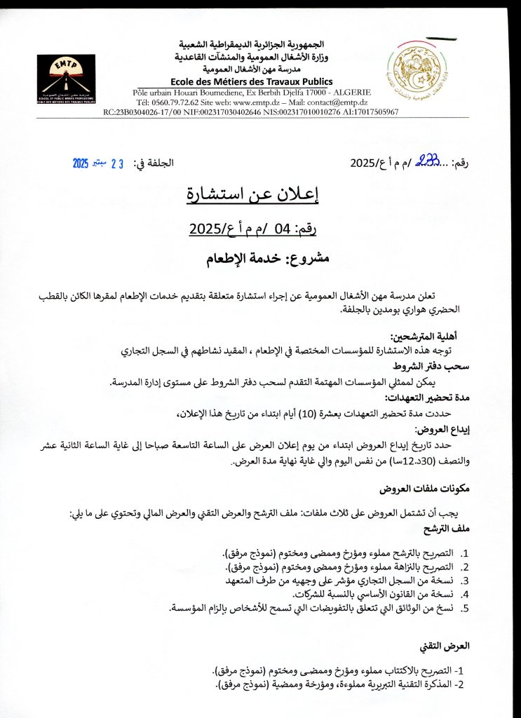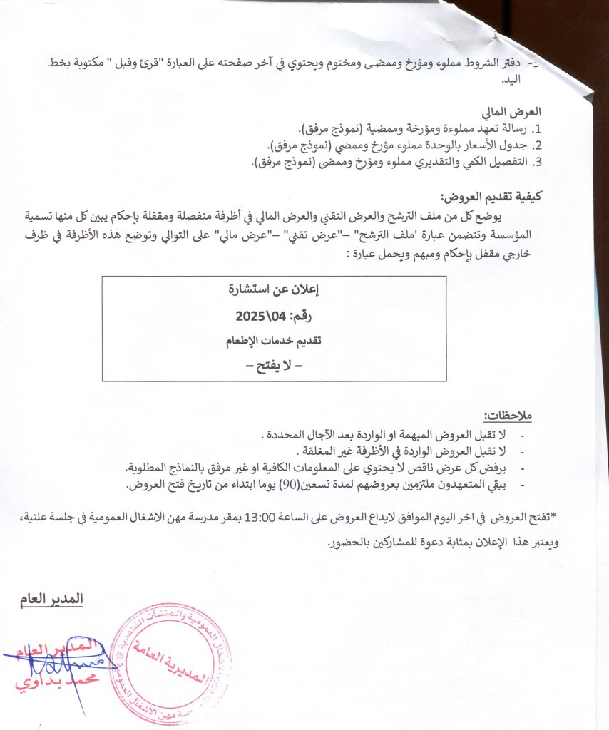 استاشرةرقم 4/2025 تتعلق بخدمة اطعام لفائدة مدرسة مهن الاشغال العمومية