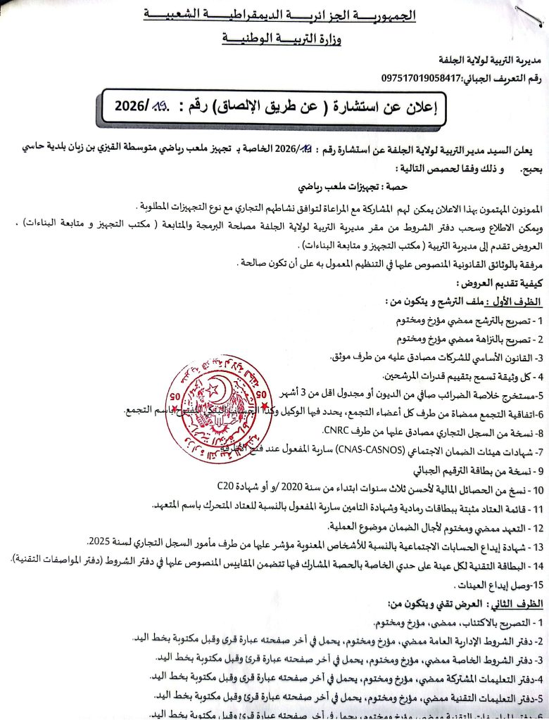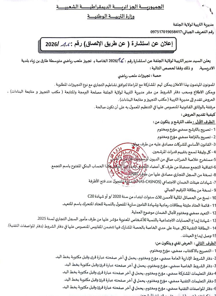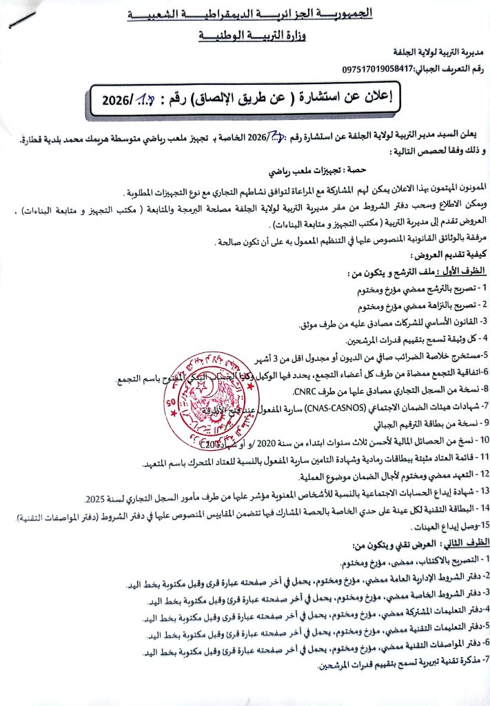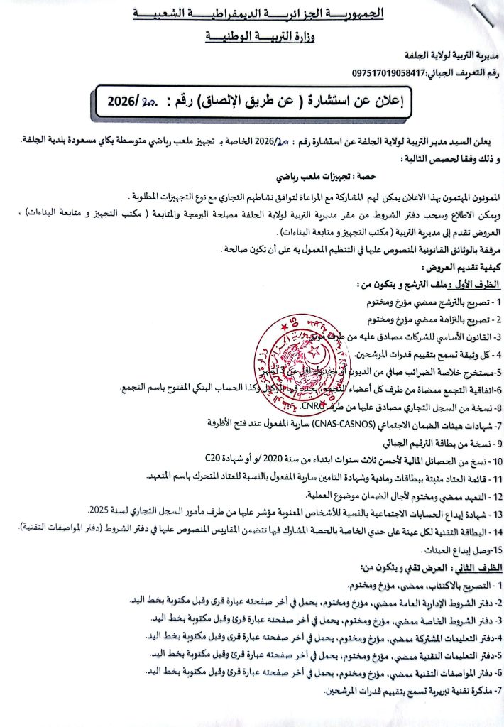 2. اعلان عن استشارات رقم 20/19/18/17/16 /2026 لمديرية التربية لولاية الجلفة