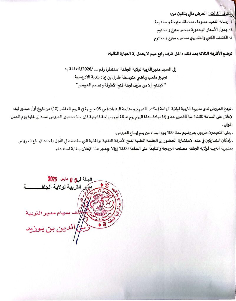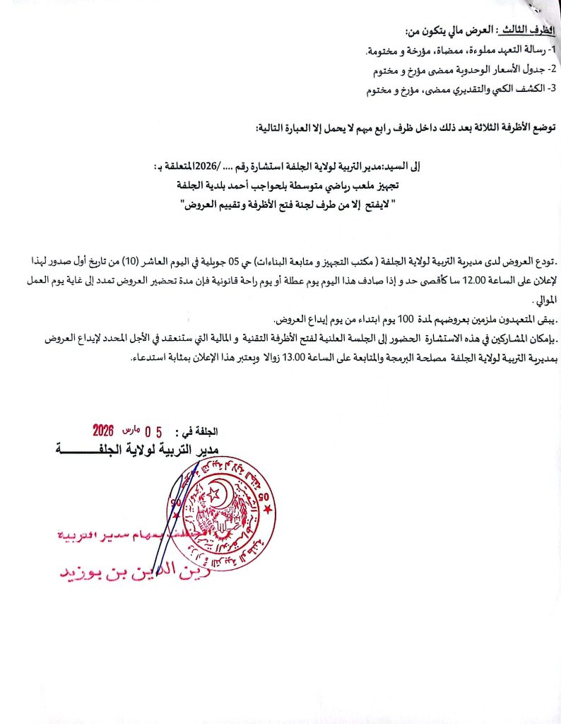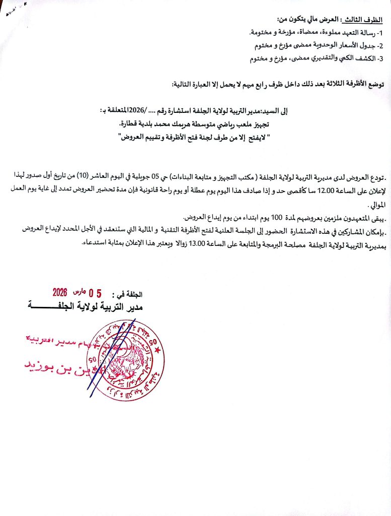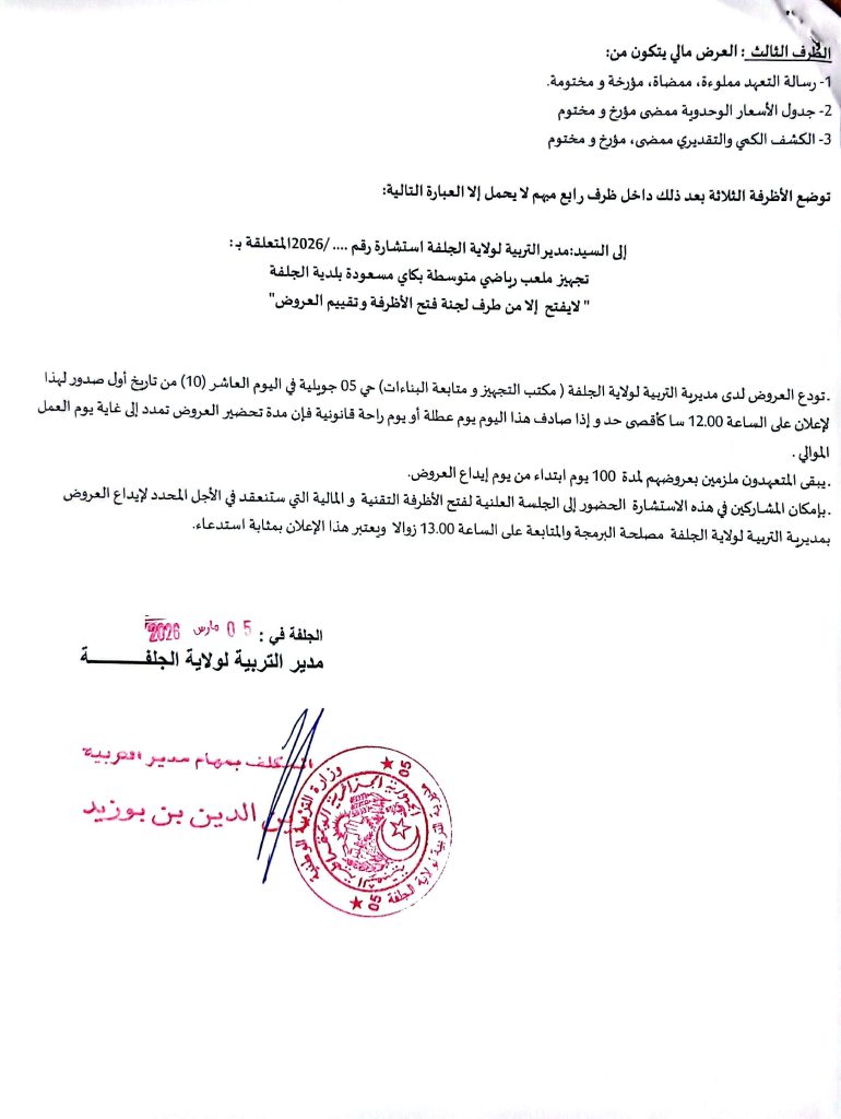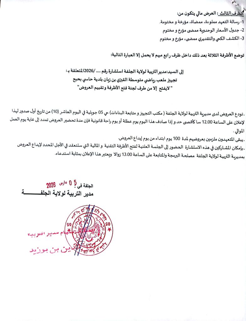 آخر الإعلانات: اعلان عن استشارة رقم 10 /2026 لمديرية وحدة بريد الجزائر لولاية الجلفةاعلان عن عدم جدوى الاستشارة رقم 11 /2026 لديوان الترقيةوالتسيير العقاري لولاية الجلفةاعلان عن إستشارات رقم 65/55/54 /2026 لبلدية عين وسارةاعذار رقم 01 من مصالح بلدية عين وسارة موجه لمؤسسة برادعي محمداعلان عن المنح المؤقت لطلب العروض رقم 17/2026 للمؤسسة العمومية الاستشفائية عين وسارةاعلان عن تصحيح المنح المؤقت لطلب العروض رقم 02/2026 لمديرية السكن لولاية الجلفةاعلان عن المنح المؤقت لطلبات العروض رقم 03/01 /2026 لمديرية السكن لولاية الجلفةاعلان عن الغاء المنح المؤقت لطلب العروض رقم 19/2026 لمديرية التعمير والهندسة المعمارية والبناء لولاية الجلفةاعلان عن طلب عروض رقم 08 /2026 لبلدية سد رحالاعلان عن طلب عروض رقم 13 /2026 لمديرية التعمير والهندسة المعمارية والبناء لولاية الجلفةاعلان عن المنح المؤقت للاستشارة رقم 09 /2026 لبلدية عين افقهاعلان عن المنح المؤقت لبلدية مسعدمنح مؤقت لبلدية عين معبدإعذار رقم 02 من مديرية السكن لولاية الجلفة موجه الى مؤسسة حميدي لخضراعلان عن المنح المؤقت لطلب العروض رقم 01 /2026 للمؤسسة العمومية الاستشفائية بمسعداعلان عن المنح المؤقت لطلب العروض رقم 03 /2026 لمديرية التعمير والهندسة المعمارية لولاية الجلفةاعلان عن الغاء استشارة رقم 10 /2026 لديوان الترقية والتسيير العقاري بالجلفةاعلان عن طلب عروض رقم 09 /2026 لبلدية الجلفةاعلان عن طلب عروض رقم 08 /2026 لبلدية سد رحالاعلان عن طلب عروض رقم 13 /2026 لمديرية التعمير والهندسة المعمارية والبناء لولاية الجلفةاعلان عن استشارة رقم 53 /2026 لبلدية عين وسارةاعلان عن المنح المؤقت لطلب العروض رقم 35 /2026 لبلدية عين وسارةاعلان عن المنح المؤقت لطلب العروض رقم 02 /2026 لبلدية الخميساعلان عن المنح المؤقت لطلب العروض رقم 04/03/2026 لبلدية الزعفراناعلان عن المنح المؤقت لطلب العروض رقم 05 /2026 لبلدية دلدولاعلان عن المنح المؤقت لطلب العروض رقم 03 /2026 لديوان الترقية والتسيير العقاري لولاية الجلفةاعلان عن طلب العروض رقم 002 /2026 لمديرية الحماية المدنية لولاية الجلفةاعلان عن طلب العروض رقم 01 /2026 للوكالة الولائية للتسيير والتنظيم العقاري بالجلفةاعلان عن استشارة رقم 52 /2026 لبلدية عين وسارةاعلان عن المنح المؤقت للاستشارة رقم 13/12 /2026 لبلدية حد الصحارياعلان عن استشارة رقم 14 /2026 لبلدية حد الصحارياعلان عن استشارة رقم 22 /2026 لمديرية السكن لولاية الجلفةاعلان عن المنح المؤقت لطلب العروض رقم 01/ 2026 لبلدية الخميساعلان عن المنح المؤقت لطلب العروض رقم 01/ 2026 لجامعة الجلفةاعلان عن المنح المؤقت لطلب العروض رقم 20/ 2026 لبلدية عين وسارةاعلان عن المنح المؤقت لطلبات العروض رقم 07/06/2026 لمديرية التعمير والهندسة المعمارية والبناء لولاية الجلفةاعلان عن المنح المؤقت لطلب العروض رقم 01/22 /2026 لمديرية الادارة المحلية لولاية الجلفةاعلان عن المنح المؤقت لطلب العروض رقم 01 /2026 لبلدية زكاراعلان عن المنح المؤقت لطلب العروض رقم 03 /2026 لبلدية عين أفقهاعلان عن المنح المؤقت لطلب العروض رقم 01 /2026 للمؤسسة العمومية الاستشفائية بحاسي بحبحاعلان عن طلب عروض رقم 02 /2026 لبلدية عين الابلاعلان عن طلب عروض رقم 09 /2026 لبلدية مسعداعلان عن طلب عروض رقم 03 /2026 لمديرية البيئة لولاية الجلفةاعلان عن طلبات عروض رقم 35/34 /2026 لمديرية السكن لولاية الجلفةاعلان عن طلبات عروض رقم 62/61 /2026 لمديرية التجهيزات العمومية لولاية الجلفةاعلان عن المنح المؤقت لطلب العروض رقم 01 /2026 لبلدية الخميساعلان عن طلبات عروض رقم 62/60 /2026 لمديرية التجهيزات العمومية لولاية الجلفةاعلان عن طلبات عروض رقم 26/25/24 /2026 لمديرية الاشعال العمومية لولاية الجلفةاعلان عن طلبات عروض رقم 34/33/32 /2026 لمديرية السكن لولاية الجلفةاعلان عن استشارة رقم 03 /2026 لفائدة الوكالة الولائية للتسيير والتنظيم العقاريين الحضريين لولاية الجلفةاعلان عن استشارات رقم 14/13 /2026 لفائدة ديوان الترقيةوالتسيير العقاري لولاية ال