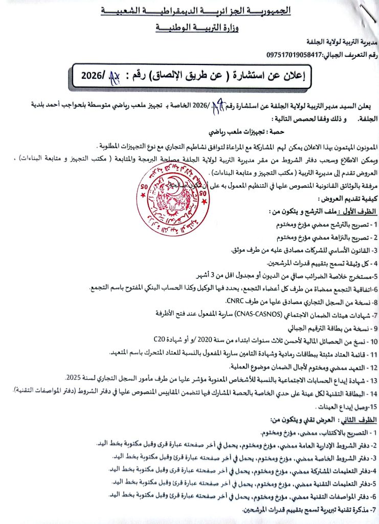 اعلان عن استشارات رقم 20/19/18/17/16 /2026 لمديرية التربية لولاية الجلفة