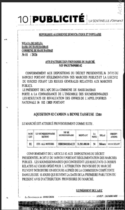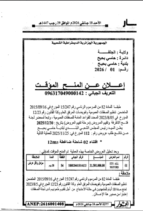 آخر الإعلانات:اعلان عن استشارة رقم 03 /2026 لبلدية دار الشيوخاعذار رقم 02 من طرف مديرية النشاط الاجتماعي لولاية الجلفة موجه لـ : – تجمع قيرع البشير – تجمع الياسميناعلان عن المنح المؤقت رقم 44 /2026 لمديرية التجهيزات العمومية لولاية الجلفةاعلان عن طلب عروض رقم 68/66 /2026 لمديرية التجهيزات العمومية لولاية الجلفةاعلان عن طلب عروض رقم 28/27 /2026 لمديرية الاشغال العمومية لولاية الجلفةاعلان عن طلب عروض رقم 04 /2026 لمديرية الشباب والرياضة لولاية الجلفةاعلان عن استشارة رقم 10/26 بلدية سد رحالاعلان عن المنح المؤقت لفائدة مديرية التجهيزات العموميةاعلان عن المنح المؤقت لفائدة مديرية التجهيزات العمو ميةاعلان عن استشارات رقم 30/29 /2026 لمديرية الاشغال العمومية لولاية الجلفةاعذار رقم 01 من مديرية البيئة لولاية الجلفة موجه لمؤسسة بن دراح علياعلان عن المنح المؤقت رقم 33/40/41/42/43 /2026 لمديرية التجهيزات العمومية لولاية الجلفةقرار رقم 06 المراجعة الثانية للمخطط التوجيهي لبلدية حاسي بحبح للاستقصاء العمومياعلان عن طلب عروض رقم 04 /2026 لبلدية بنهاراعلان عن طلب عروض رقم 05 /2026 لبلدية الدويساعلان عن طلب عروض رقم 64/65 /2026 لمديرية التجهيزات العمومية لولاية الجلفةاعلان عن طلب عروض رقم 01 /2026 لجامعة الجلفةاعذارت من مديرية الاشغال العمومية لولاية الجلفة موجه لمؤسسات : – ضيف محمد – قرادي محمد -بورزيق احمداعلان عن المنح المؤقت رقم 31/33/34/35/36/37/38/ 39/ 2026 لمديرية التجهيزات العمومية لولاية الجلفةاعلان عن استشارة رقم 15 /2026 لبلدية حد الصحارياعلان عن منح مؤقت لطلب العروض رقم 06 /2024 لجامعة الجلفةاعلان عن طلب عروض رقم 02 /2026 + منح مؤقت لجامعة الجلفةاعلان عن استشارة رقم 12 /2026 لمديرية وحدة بريد الجزائر لولاية الجلفةاعلان عن استشارة رقم 10 /2026 للمؤسسة العمومية الاستشفائية الام والطفل بالجلفةاعلان عن الغاء استشارة رقم 09 /2026 للمؤسسة العمومية الاستشفائية الام والطفل بالجلفةاعلان عن المنح المؤقت للاستشارة رقم 06 / 2026 لمديرية الحماية المدنية لولاية الجلفةاعلان عن المنح المؤقت رقم 05/04/03 / 2026 لمديرية الحماية المدنية لولاية الجلفةاعلان عن الغاء استشارة رقم 59 /2026 لبلدية عين وسارةاعلان عن استشارات رقم 58/60 /2026 لبلدية عين وسارةاعلان عن التأهيل في المسابقة الوطنية المحدودة في الهندسة المعمارية لمديرية التعمير لولاية الجلفةاعلان عن المنح المؤقت لطلب العروض رقم 06 /2026 لبلدية الجلفةاعلان عن منح مؤقت رقم 29/30/31/34 /2026 لمديرية التجهيزات العمومية لولاية الجلفةاعلان عن طلب عروض رقم 63 /2026 لمديرية التجهيزات العمومية لولاية الجلفةاعلان عن طلب عروض رقم 06/05 /2026 لبلدية دار الشيوخاعلان عن المنح المؤقت لبلدية الشارفاعذار ثاني من مديرية السكن لولاية الجلفة موجه لمؤسسة برادعي محمداعذار ثاني من مديرية التعمير لولاية الجلفة موجه لمؤسسة ذياب سعداعلان عن المنح المؤقت لطلب العروض لمديرية التجهيزات العمومية لولاية الجلفةاعلان عن التأهيل الاولي للمسابقة الوطنية في الهندسة المعمارية لديوان الترقيةوالتسيير العقاري لولاية الجلفةاعلان عن عدم جدوى طلب العروض لمديرية الشباب والرياضة لولاية الجلفةاعلان عن تصحيح المنح المؤقت رقم 01 /2026 للمؤسسة العمومية الاستشفائية بحاسي بحبحاعلان عن المنح المؤقت لبلدية دار الشيوخاعلان عن الغاء استشارات رقم 16/15/14/13 /2026 لمديرية التربية لولاية الجلفةاعلان عن الغاء استشارات رقم 12/11/10/09 /2026 لمديرية التربية لولاية الجلفةاعلان عن الغاء استشارات رقم 08/07/06/05 /2026 لمديرية التربية لولاية الجلفةاعلان عن الغاء استشارات رقم 04/03/02/01 /2026 لمديرية التربية لولاية الجلفةاعلان عن استشارة رقم 11 /2026 لمديرية وحدة بريد الجزائر لولاية الجلفةاعلان عن المنح المؤقت للاستشارة رقم 12 /2026 لديوان الترقيةوالتسيير العقاري لولاية الجلفةاعذار رقم 02 من طرف مديرية السكن لولاية الجلفة موجه لمؤسسة برادعي محمداعذار اول من طرف مديرية الثقافة لولاية الجلفة موجه لتجمع الاز