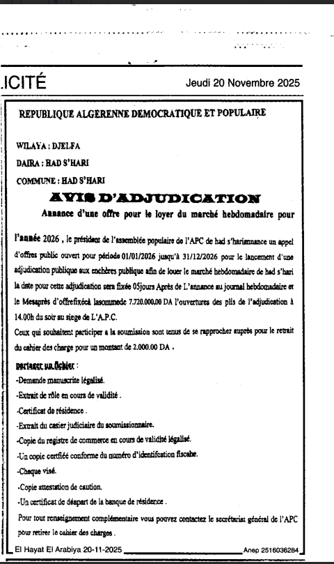 • اعلان عن المنح المؤقت لطلب العروض رقم 06/ 2026 لبلدية الجلفة