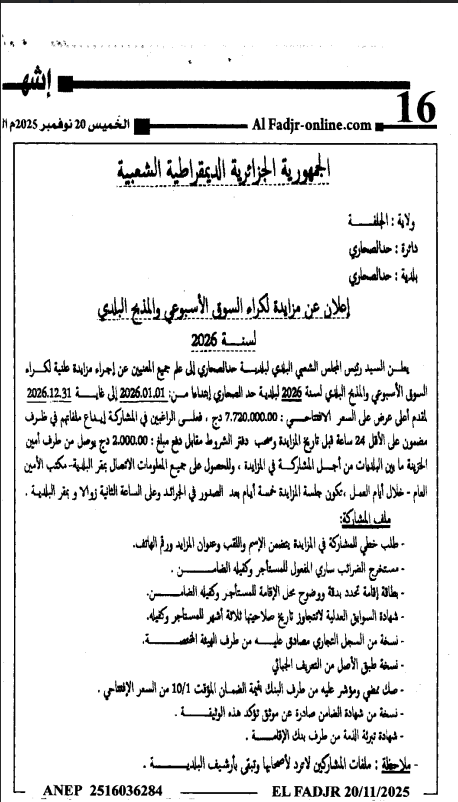 آخر الإعلانات: اعلان عن المنح المؤقت للاستشارة رقم 12 /2026 لديوان الترقيةوالتسيير العقاري لولاية الجلفةاعذار رقم 02 من طرف مديرية السكن لولاية الجلفة موجه لمؤسسة برادعي محمداعذار اول من طرف مديرية الثقافة لولاية الجلفة موجه لتجمع الازدهاراعلان عن المنح المؤقت لطلب العروض رقم 06/ 2026 لبلدية الجلفةاعلان عن الغاء المنح المؤقت لطلب العروض رقم 05/2026 لبلدية سد رحالاعلان عن عدم جدوى طلب العروض لمديرية الشباب والرياضة لولايةالجلفةاعلان عن المنح المؤقت لمديرية الشباب والرياضة لولايةالجلفةاعلان عن المنح المؤقت لطلب العروض رقم 38/ 2026 لمديرية التجهيزات العمومية لولايةالجلفةاعلان عن الغاء المنح المؤقت لطلب العروض رقم 19/2026 لمديرية التعمير والهندسة المعمارية والبناء لولايةالجلفةاعلان عن طلب عروض رقم 05/ 2026 لبلدية الجلفةاعلان عن طلب عروض رقم 03/ 2026 لمديرية الشباب والرياضة لولاية الجلفةاعلان عن طلب عروض رقم 13/12/ 2026 لمديرية التعمير والهندسة المعمارية والبناء لولاية الجلفةاعلان عن استشارة رقم 10 /2026 لمديرية وحدة بريد الجزائر لولاية الجلفةاعلان عن عدم جدوى الاستشارة رقم 11 /2026 لديوان الترقيةوالتسيير العقاري لولاية الجلفةاعلان عن إستشارات رقم 65/55/54 /2026 لبلدية عين وسارةاعذار رقم 01 من مصالح بلدية عين وسارة موجه لمؤسسة برادعي محمداعلان عن المنح المؤقت لطلب العروض رقم 17/2026 للمؤسسة العمومية الاستشفائية عين وسارةاعلان عن تصحيح المنح المؤقت لطلب العروض رقم 02/2026 لمديرية السكن لولاية الجلفةاعلان عن المنح المؤقت لطلبات العروض رقم 03/01 /2026 لمديرية السكن لولاية الجلفةاعلان عن الغاء المنح المؤقت لطلب العروض رقم 19/2026 لمديرية التعمير والهندسة المعمارية والبناء لولاية الجلفةاعلان عن طلب عروض رقم 08 /2026 لبلدية سد رحالاعلان عن طلب عروض رقم 13 /2026 لمديرية التعمير والهندسة المعمارية والبناء لولاية الجلفةاعلان عن المنح المؤقت للاستشارة رقم 09 /2026 لبلدية عين افقهاعلان عن المنح المؤقت لبلدية مسعدمنح مؤقت لبلدية عين معبدإعذار رقم 02 من مديرية السكن لولاية الجلفة موجه الى مؤسسة حميدي لخضراعلان عن المنح المؤقت لطلب العروض رقم 01 /2026 للمؤسسة العمومية الاستشفائية بمسعداعلان عن المنح المؤقت لطلب العروض رقم 03 /2026 لمديرية التعمير والهندسة المعمارية لولاية الجلفةاعلان عن الغاء استشارة رقم 10 /2026 لديوان الترقية والتسيير العقاري بالجلفةاعلان عن طلب عروض رقم 09 /2026 لبلدية الجلفةاعلان عن طلب عروض رقم 08 /2026 لبلدية سد رحالاعلان عن طلب عروض رقم 13 /2026 لمديرية التعمير والهندسة المعمارية والبناء لولاية الجلفةاعلان عن استشارة رقم 53 /2026 لبلدية عين وسارةاعلان عن المنح المؤقت لطلب العروض رقم 35 /2026 لبلدية عين وسارةاعلان عن المنح المؤقت لطلب العروض رقم 02 /2026 لبلدية الخميساعلان عن المنح المؤقت لطلب العروض رقم 04/03/2026 لبلدية الزعفراناعلان عن المنح المؤقت لطلب العروض رقم 05 /2026 لبلدية دلدولاعلان عن المنح المؤقت لطلب العروض رقم 03 /2026 لديوان الترقية والتسيير العقاري لولاية الجلفةاعلان عن طلب العروض رقم 002 /2026 لمديرية الحماية المدنية لولاية الجلفةاعلان عن طلب العروض رقم 01 /2026 للوكالة الولائية للتسيير والتنظيم العقاري بالجلفةاعلان عن استشارة رقم 52 /2026 لبلدية عين وسارةاعلان عن المنح المؤقت للاستشارة رقم 13/12 /2026 لبلدية حد الصحارياعلان عن استشارة رقم 14 /2026 لبلدية حد الصحارياعلان عن استشارة رقم 22 /2026 لمديرية السكن لولاية الجلفةاعلان عن المنح المؤقت لطلب العروض رقم 01/ 2026 لبلدية الخميساعلان عن المنح المؤقت لطلب العروض رقم 01/ 2026 لجامعة الجلفةاعلان عن المنح المؤقت لطلب العروض رقم 20/ 2026 لبلدية عين وسارةاعلان عن المنح المؤقت لطلبات العروض رقم 07/06/2026 لمديرية التعمير والهندسة المعمارية والبناء لولاية الجلفةاعلان عن المنح المؤقت لطلب العروض رقم 01/22 /2026 لمديرية الادارة المحلية لولاية الجلفةاعلان عن المنح المؤقت لطلب العروض رقم 01 /2026 لبلدية ز