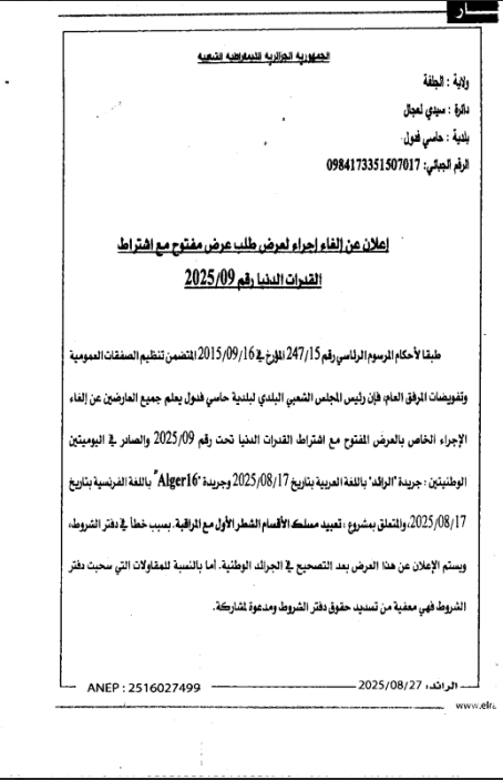 إعلان عن إلغاء الإجراء الخاص بمشروع تعبيد مسلك الأقسام الشطر الأول مع المراقبة صاحب المشروع بلدية حاسي فدول