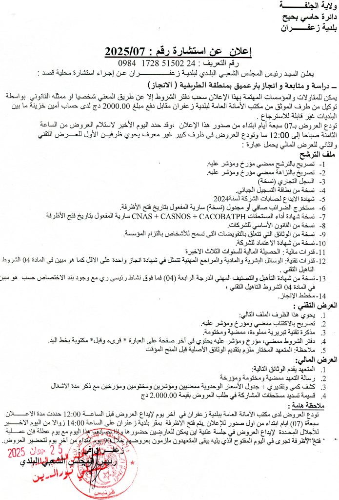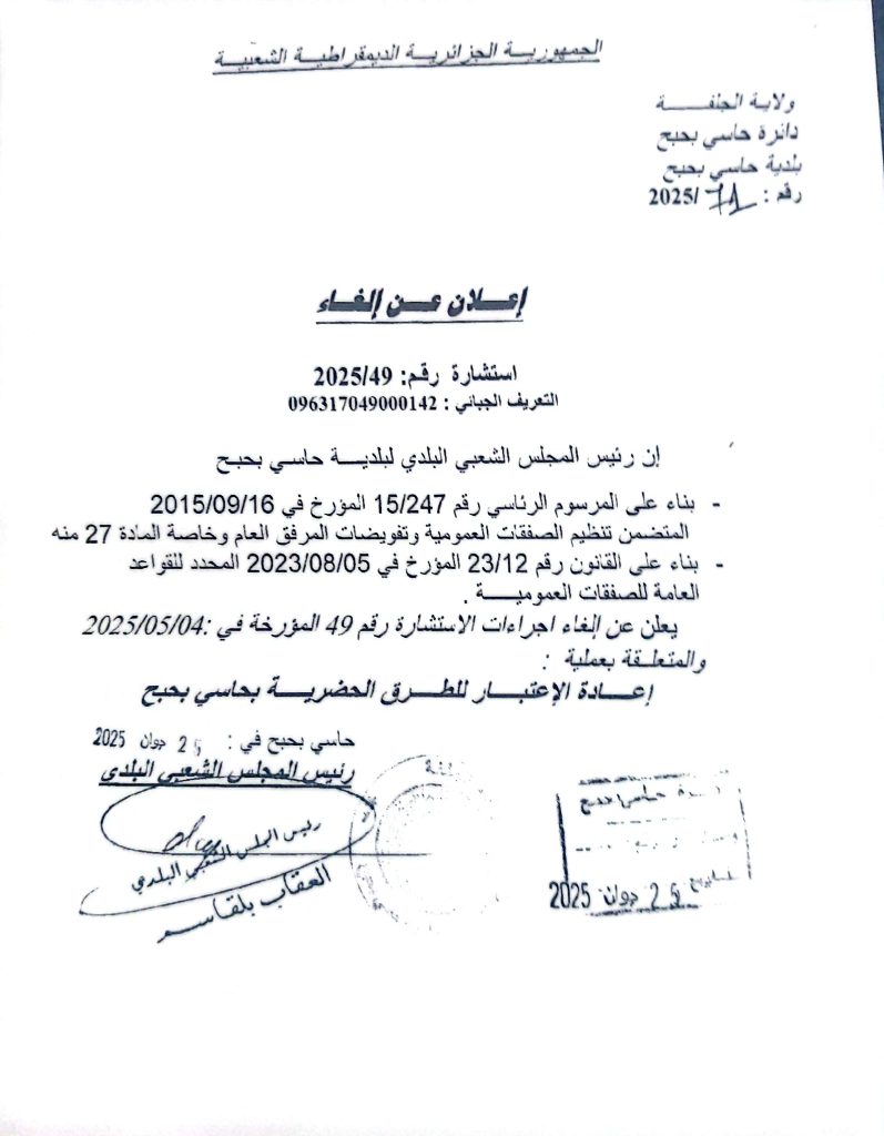إعلان عن الغاء استشارة رقم 49/2025 لبلدية حاسي بحبح+استشارة رقم 07 /2025 لبلدية زعفران
