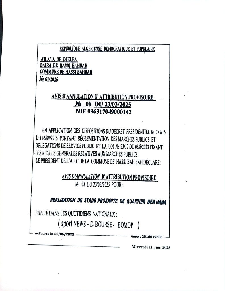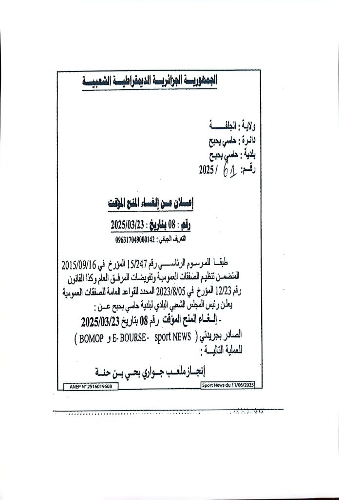 إعلان عن الغاء المنح المؤقت رقم 61/2025لبلدية حاسي بحبح