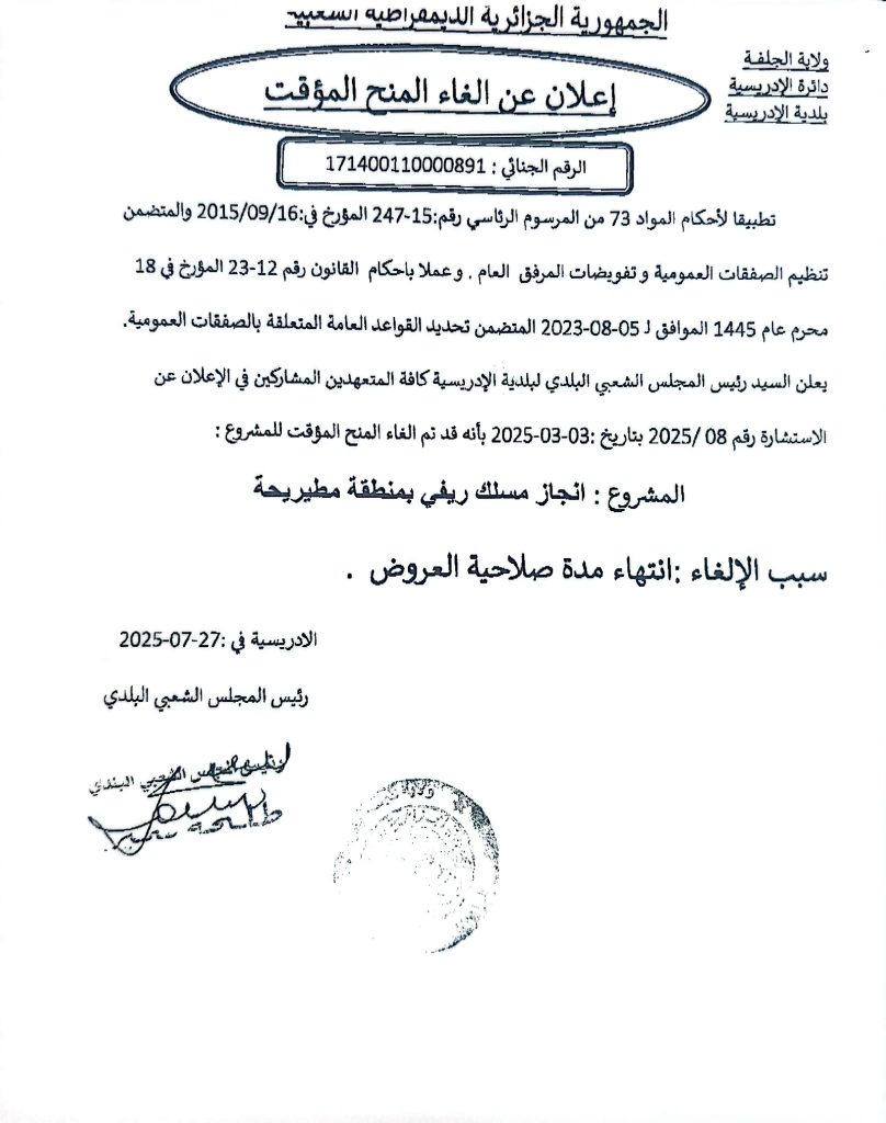 إعلان عن الغاء المنح المؤقت للاستشارة رقم 08/2025 لبلدية الادريسية