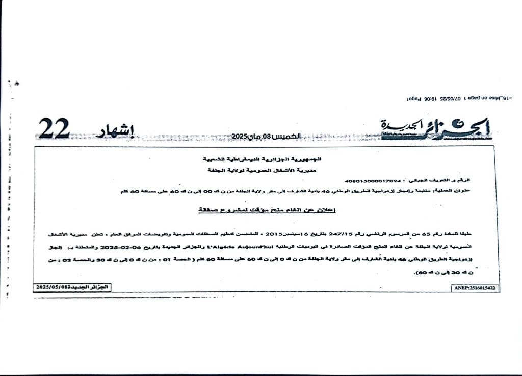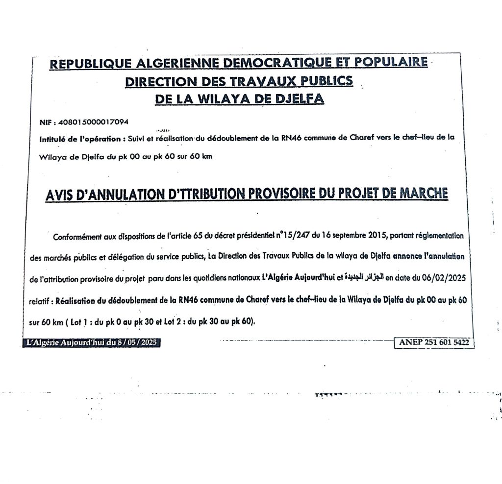 إعلان عن الغاء المنح المؤقت لمديرية الاشغال العمومية لولاية الجلفة