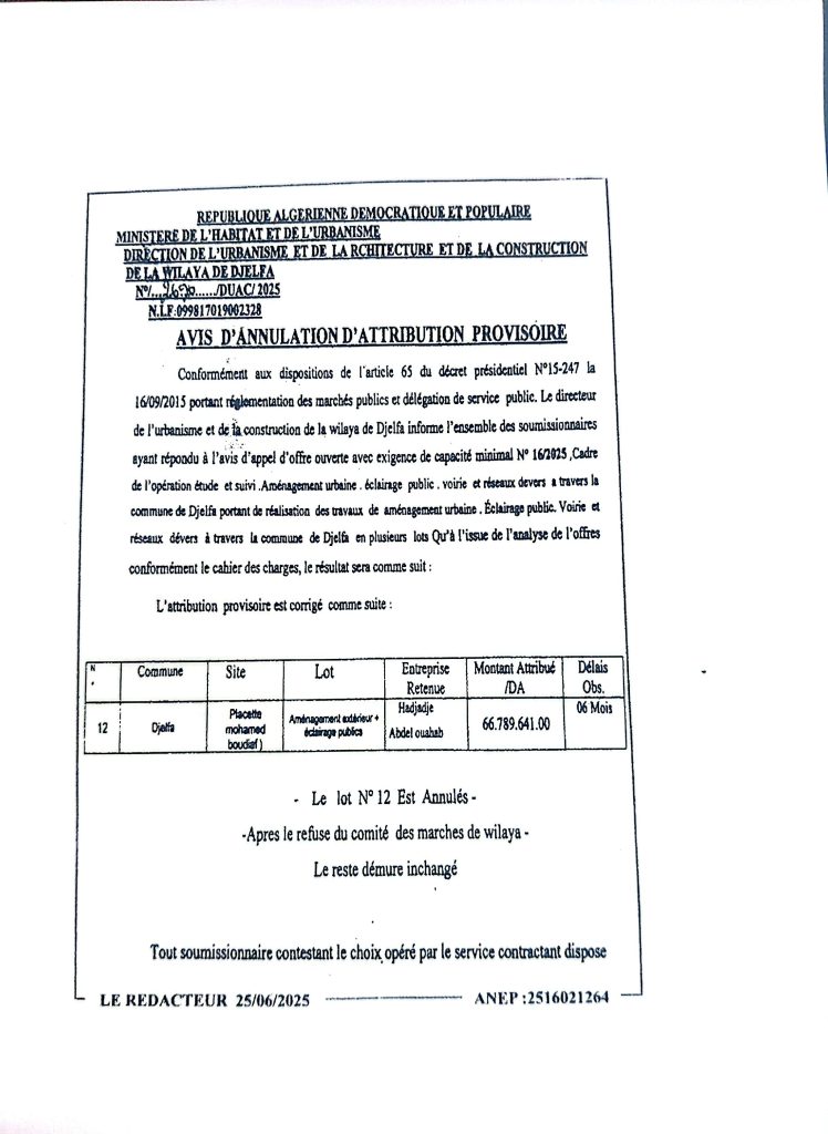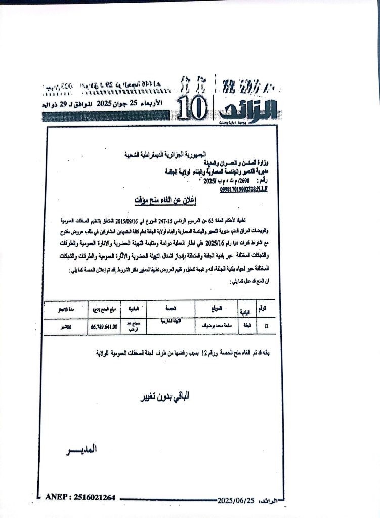 إعلان عن الغاء المنح المؤقت لمديرية التعمير والهندسة المعمارية لولاية الجلفة