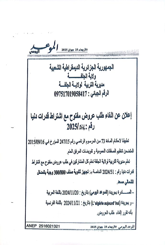 2. إعلان عن الغاء طلب عروض رقم 04/2025 لمديرية التربية لولاية الجلفة