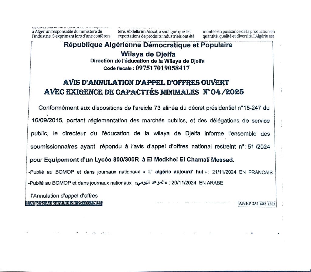 إعلان عن الغاء طلب عروض رقم 04/2025 لمديرية التربية لولاية الجلفة