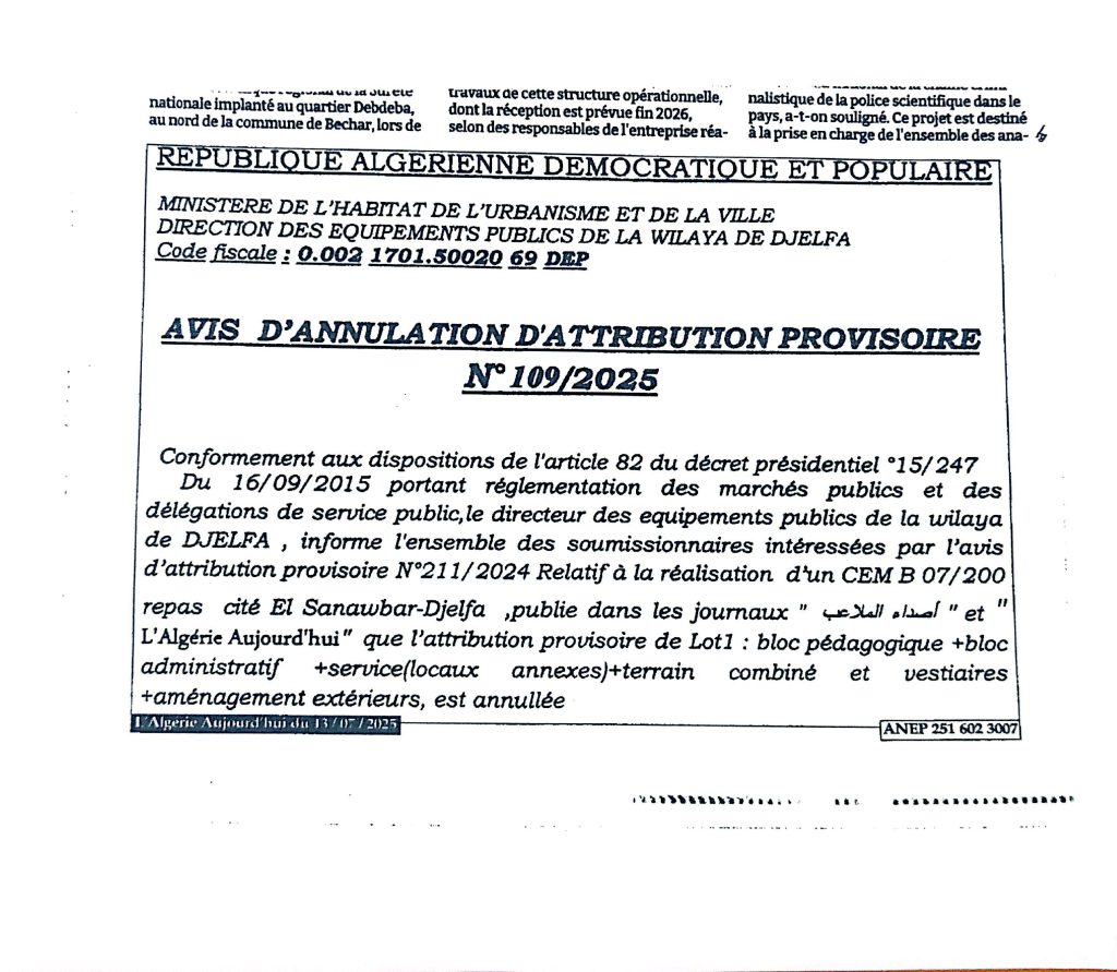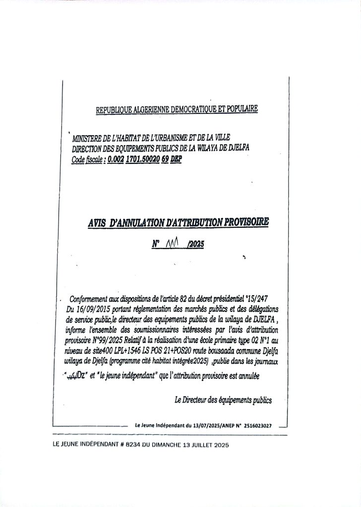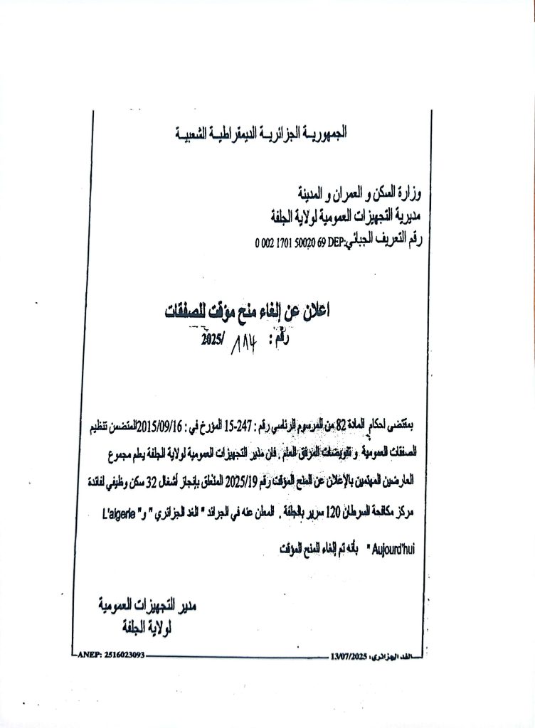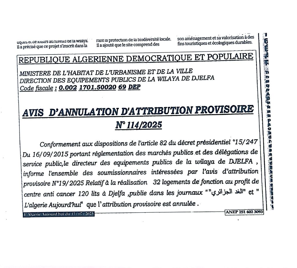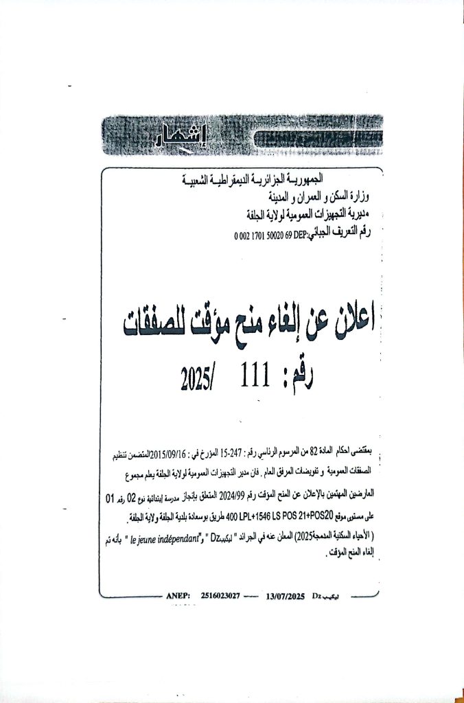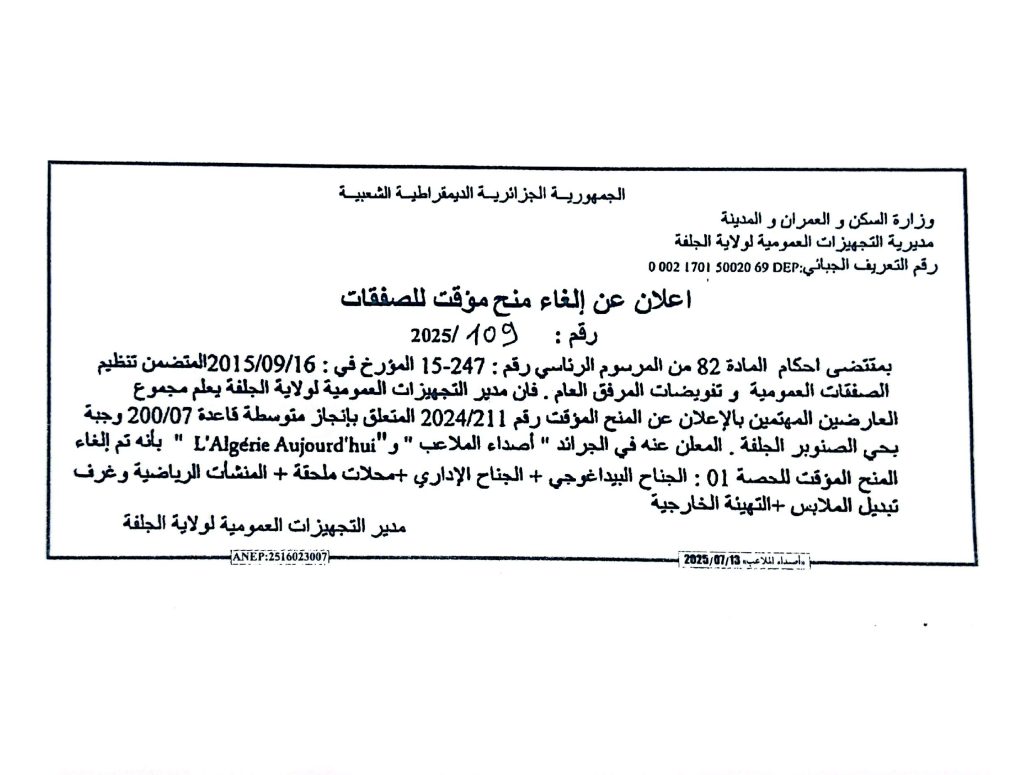 إعلان عن الغاء منح مؤقت رقم 109/111/114/2025 لمديرية التجهيزات العموميةلولاية الجلفة