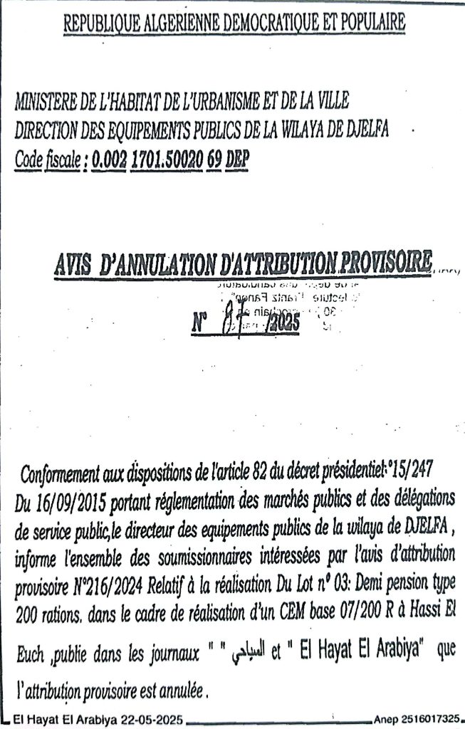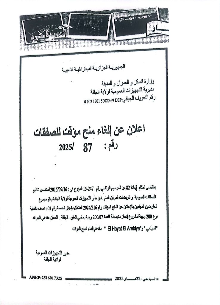 إعلان عن الغاء منح مؤقت رقم 87/2025لمديرية التجهيزات العمومية لولاية الجلفة