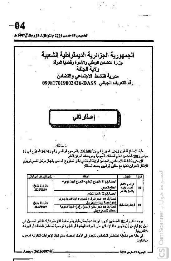 • اعلان عن استشارات رقم 21/32 /2026 لمديرية التربية لولاية الجلفة