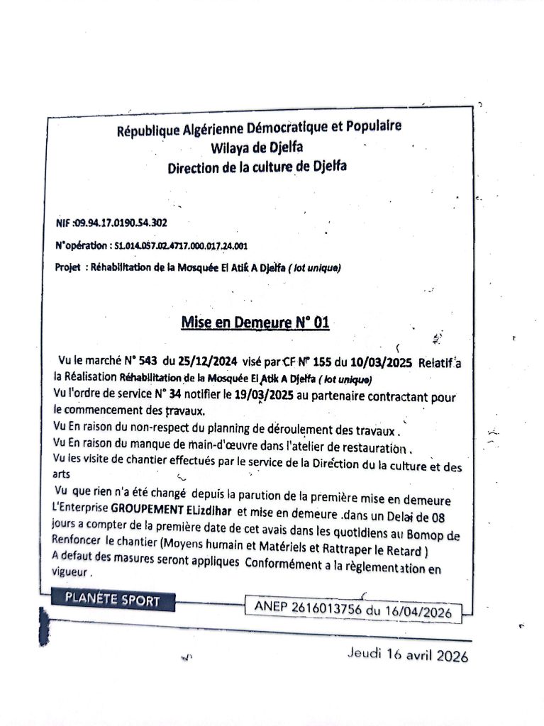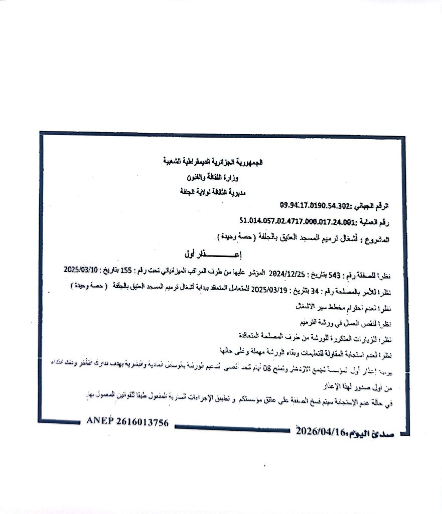 اعذار اول من طرف مديرية الثقافة لولاية الجلفة موجه لتجمع الازدهار