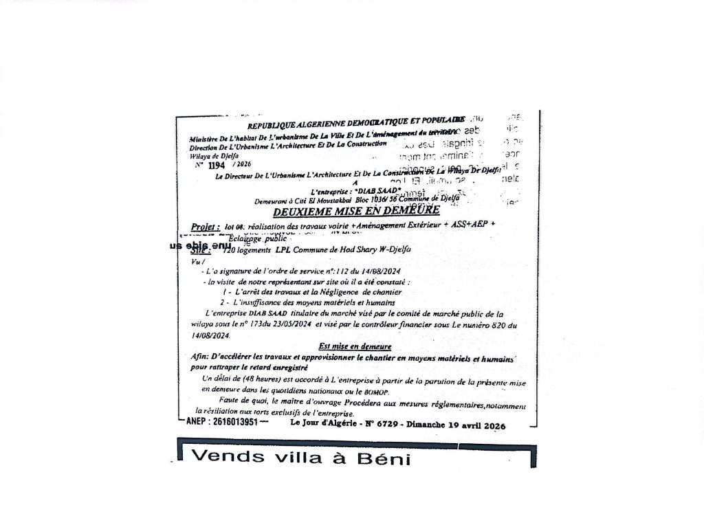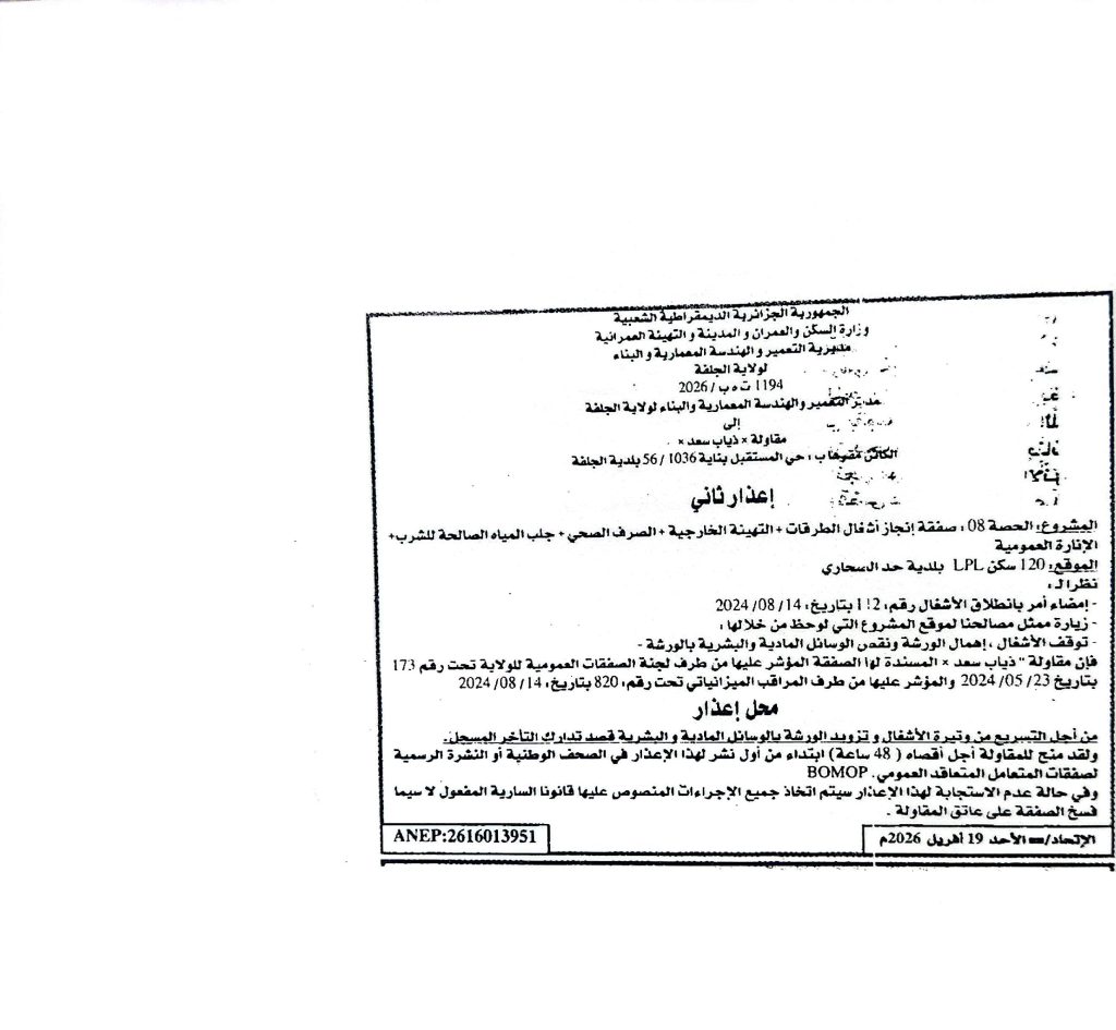 اعذار ثاني من مديرية التعمير لولاية الجلفة موجه لمؤسسة ذياب سعد