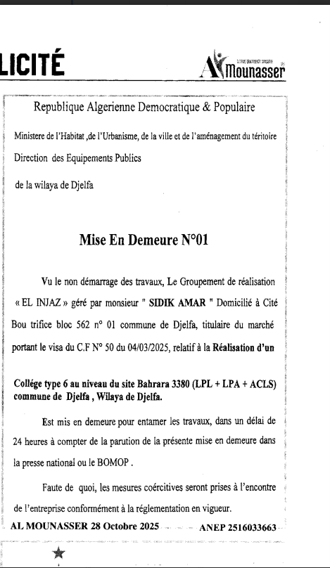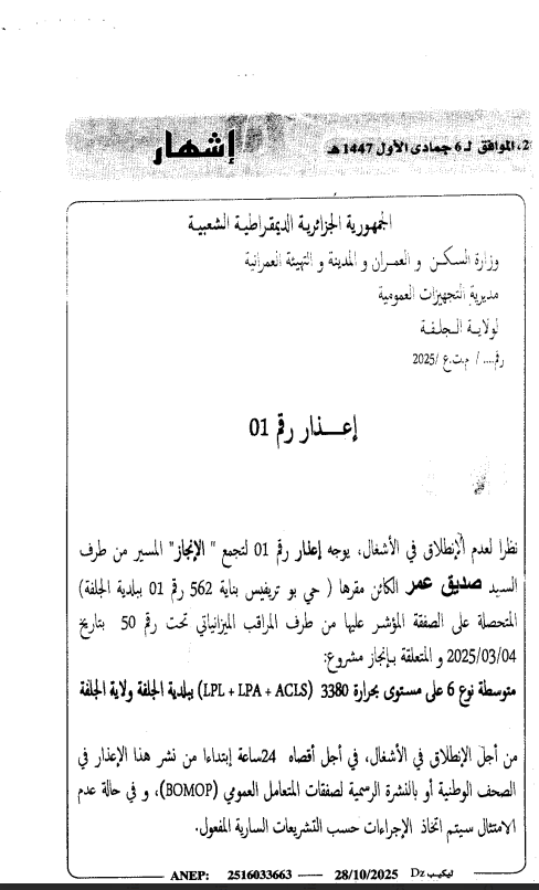 اعذار ثاني لمقاولة اشغال البناء دحمان محمد لفائدة ديوان الترقية و التسيير العقاري