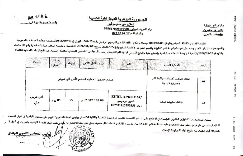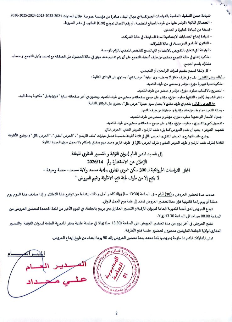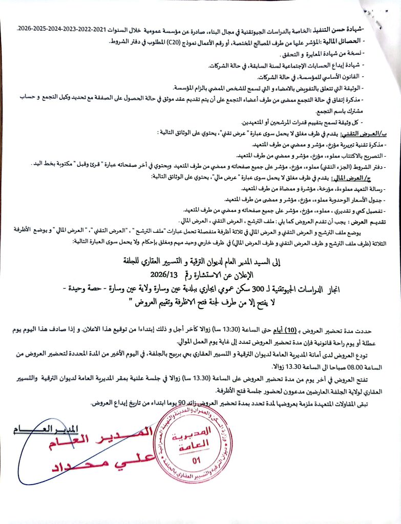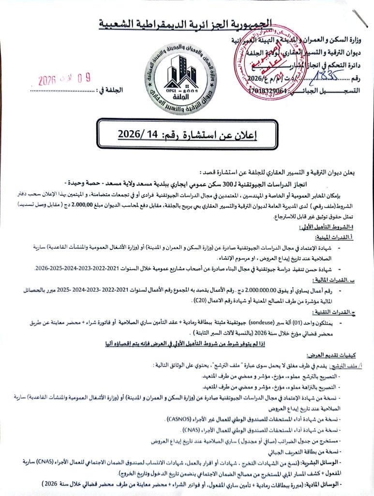 اعلان عن استشارات رقم 14/13 /2026 لفائدة ديوان الترقيةوالتسيير العقاري لولاية الجلفة + المنح المؤقت لبلدية البيرين