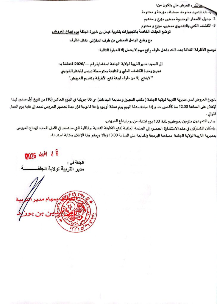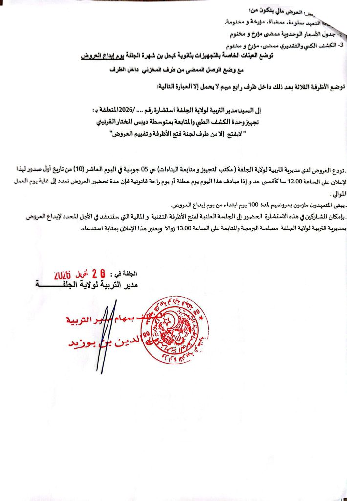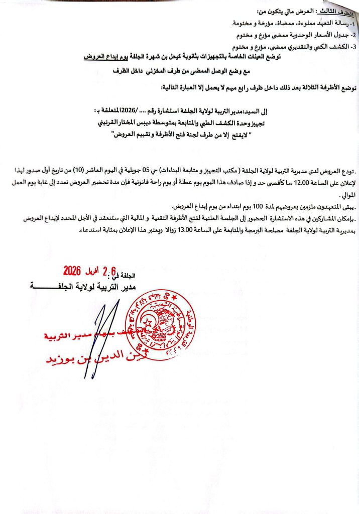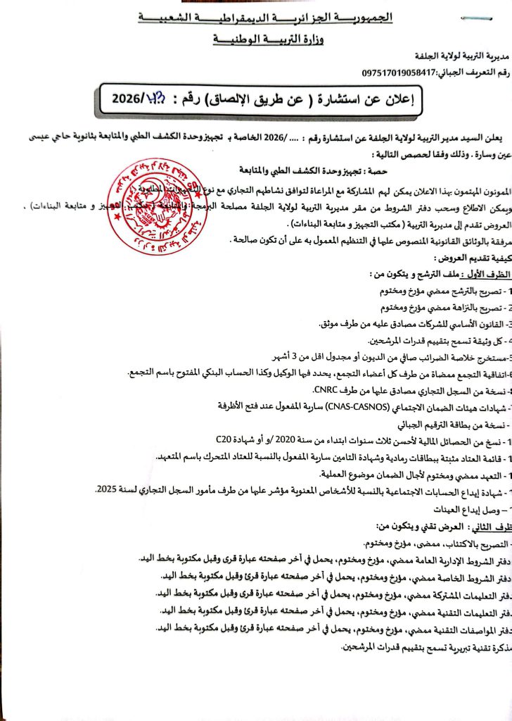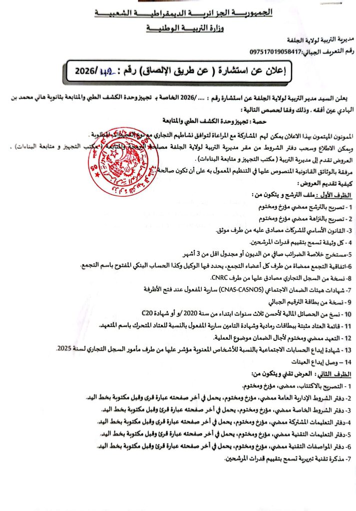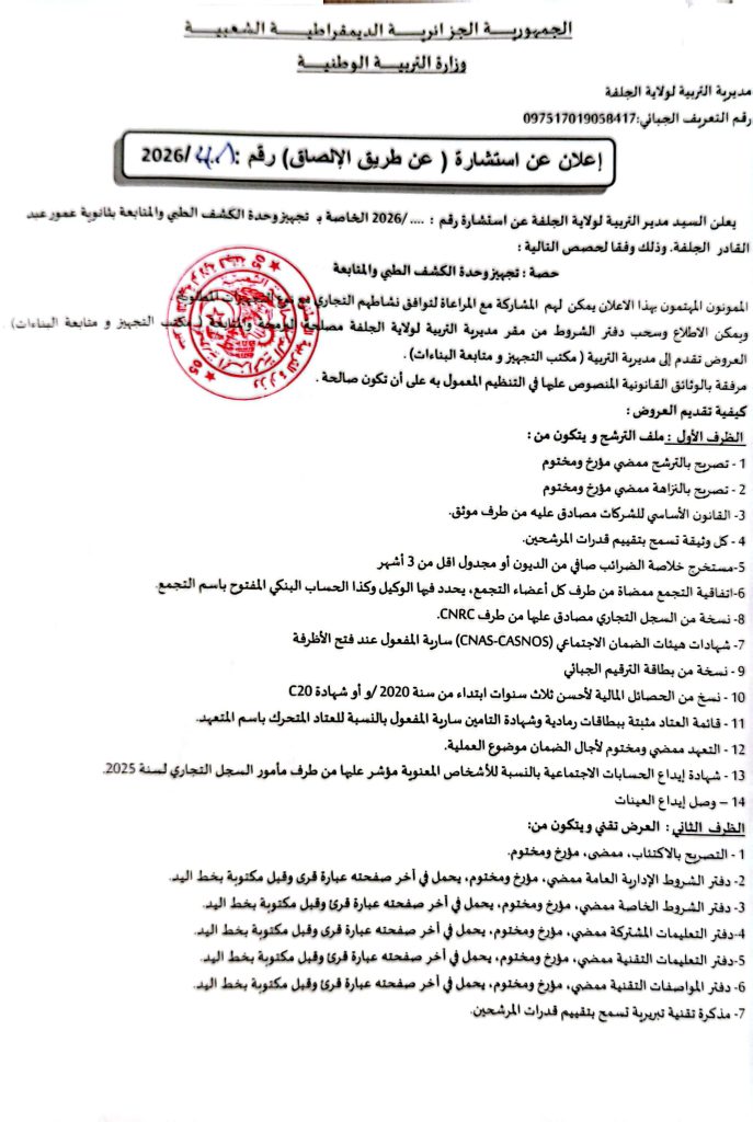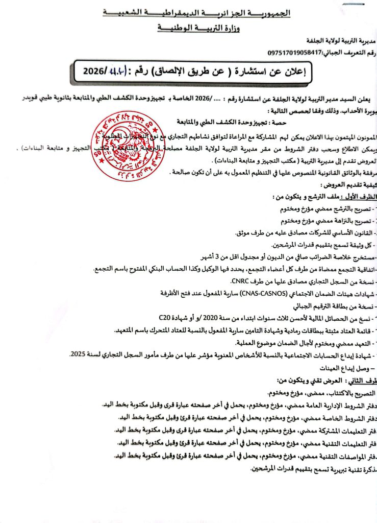 اعلان عن استشارات رقم 44/43/42/41 /2026 لفائدة مديرية التربية لولاية الجلفة