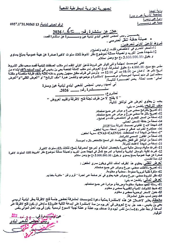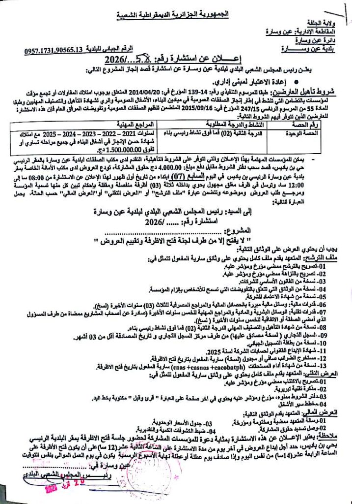 اعلان عن استشارات رقم 58/60 /2026 لبلدية عين وسارة