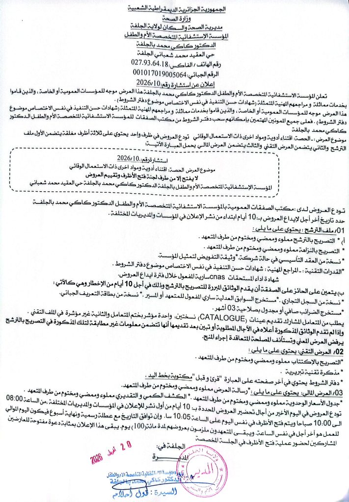 اعلان عن استشارة رقم 10 /2026 للمؤسسة العمومية الاستشفائية الام والطفل بالجلفة
