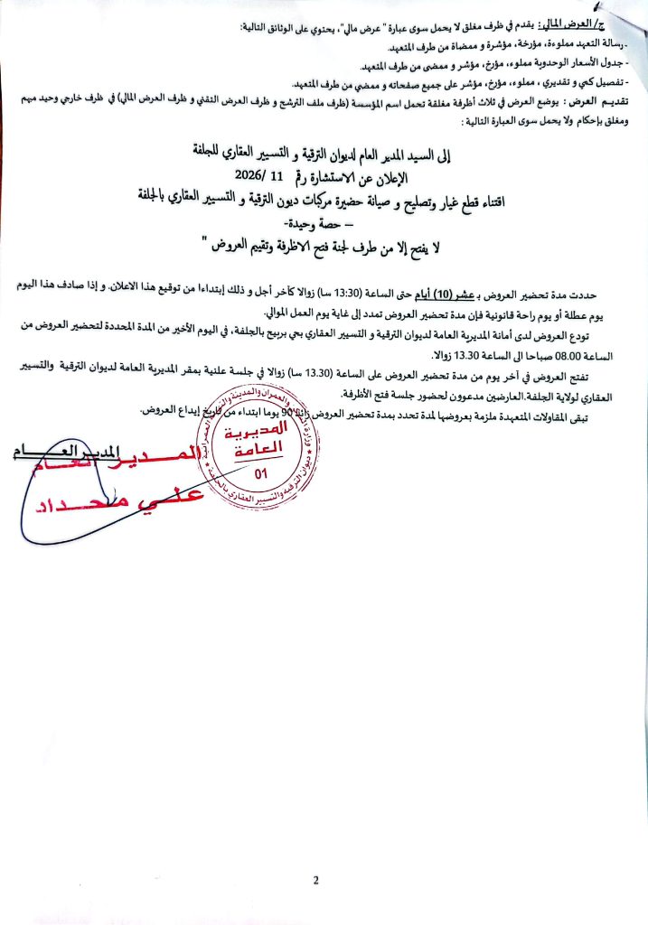 آخر الإعلانات:اعلان عن استشارة رقم 12 /2026 لديوان الترقية والتسيير العقاري لولاية الجلفةاعلان عن المنح المؤقت لطلب العروض رقم 03 /2026 لبلدية دار الشيوخاعلان عن المنح المؤقت لطلب العروض رقم 02 /2026 لبلدية دار الشيوخاعلان عن المنح المؤقت لطلب العروض رقم 05 /2026 لبلدية البيريناعلان عن استشارة رقم 11 /2026 لديوان الترقية والتسيير العقاري لولاية الجلفةاعذار من مديرية السكن لولاية الجلفة موجه لمؤسسة قرماط رضا سفياناعذار من مديرية التجهيزات العمومية لولاية الجلفة موجه لمؤسسة جاب الله عبد الرحماناعلان عن عدم جدوى طلب العروض رقم 06/ 2026 لبلدية البيريناعلان عن عدم جدوى طلب العروض رقم 04/ 2026 لبلدية البيريناعلان عن عدم جدوى طلب العروض رقم 02/ 2026 لجامعة الجلفةاعلان عن عدم جدوى طلب العروض رقم 06/ 2026 لمديرية السكن لولاية الجلفةاعلان عن عدم جدوى طلب العروض رقم 05/ 2026 لمديرية السكن لولاية الجلفةاعلان عن طلب العروض رقم 05/ 2026 لبلدية بنهاراعلان عن طلب العروض رقم 08/ 2026 لبلدية البيريناعلان عن استشارات رقم 04/03/ 2026 لبلدية دار الشيوخاعلان عن استشارة رقم 29/ 2026 لبلدية المليليحةاعلان عن استشارة رقم 27/ 2026 لبلدية مسعداعلان عن استشارات رقم 41/40/ 2026 لبلدية عين وسارةاعلان عن استشارة رقم 09/ 2026 مديرية وحدة بريد الجزائر لولاية الجلفةاعلان عن عدم جدوى للإستشارات رقم 10 /2026 لمؤسسة الجزائرية للمياه وحدة الجلفةاعلان عن المنح المؤقت للإستشارات رقم 06/02 /2026 لمؤسسة الجزائرية للمياه وحدة الجلفةاعلان عن المنح المؤقت لطلب العروض رقم 34/ 2026 لمديرية التجهيزات العمومية لولاية الجلفةإعذار رقم 01 من مديرية السكن لولاية الجلفة موجه لمؤسسة جاب الله عبد الرحمانإعذار رقم 02 من مديرية السكن لولاية الجلفة موجه لمؤسسة قرماط رضا سفياناعلان عن المنح المؤقت للاستشارة رقم 09 /2026 لمديرية التعمير والهندسة المعمارية والبناء لولاية الجلفةاعلان عن توظيف لفائدة المستشفى المختلط المجاهد هتهات بوبكر بالجلفةاعلان عن المنح المؤقت للمديرية الاشغال العمومية لولاية الجلفةاعلان عن المنح المؤقت لطلب العروض رقم 03 /2026 لبلدية الجلفةاعلان عن المنح المؤقت لمديرية الاشغال العمومية لولاية الجلفةاعلان عن طلبات عروض رقم 48/47/46/45/44/43 /2026 لمديرية التجهيزات العمومية لولاية الجلفةاعلان عن المنح المؤقت لبلدية عين معبداعلان عن الاستشارة رقم 13/12/ 2026 لبلدية حد الصحارياعلان عن المنح المؤقت للاستشارة رقم 11/ 2026 لبلدية حد الصحارياعلان عن المنح المؤقت لطلب العروض رقم02/ 2026 لديوان الترقية والتسيير العقاري لولاية الجلفةاعلان عن المنح المؤقت لطلب العروض رقم02/01/ 2026 لبلدية حد الصحارياعلان عن طلب عروض رقم 04 /2026 لبلدية سيدي لعجالاعلان عن طلب عروض رقم 03 /2026 لبلدية حاسي فدولاعلان عن مزايدة لكراء السوق الاسبوعية لبلدية البيريناعلان عن طلب عروض رقم 53/51/50/43 /2026 لمديرية التجهيزات العمومية لولاية الجلفةاعذار ثاني من بلدية ام العظام موجه لتجمع آفاق هيدرواعذار من بلدية الشارف موجه لمؤسسة العايبي للاشغال الكبرىاعلان عن المنح المؤقت لطلب العروض رقم09/14/15/ 2026 لمديرية السكن لولاية الجلفةاعلان عن المنح المؤقت لبلدية حاسي فدولاعلان عن المنح المؤقت لطلب العروض رقم02/04/2026 لبلدية الجلفةاعلان عن عدم جدوى لطلب العروض رقم 04/ 2026 لبلدية الدويساعلان عن المنح المؤقت لطلب العروض رقم 02/01/03/ 2026 لبلدية الدويساعلان عن مسابقة وطنية محدودة في الهندسة المعمارية رقم 49/ 2026 لمديرية التجهيزات العمومية لولاية الجلفةاعلان عن طلب العروض رقم 53/52/49/ 2026 لمديرية التجهيزات العمومية لولاية الجلفةاعلان عن المنح المؤقت للاستشارة رقم 08/ 2026 لديوان الترقية والتسيير العقاري لولاية الجلفةاعذار رقم 02 من مديرية الشباب والرياضة لولاية الجلفة موجه لمؤسسات: – MDA المسير كراتاس ايردال – مؤسسة زيتوني اسماعيلاعذار رقم 01 من مديرية السكن لولاية الجلفة موجه لمؤسسة برادعي محمداعلان عن المنح المؤقت رقم 18 /2026 لبلدية المليليحةاعلان عن 