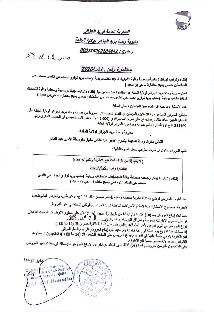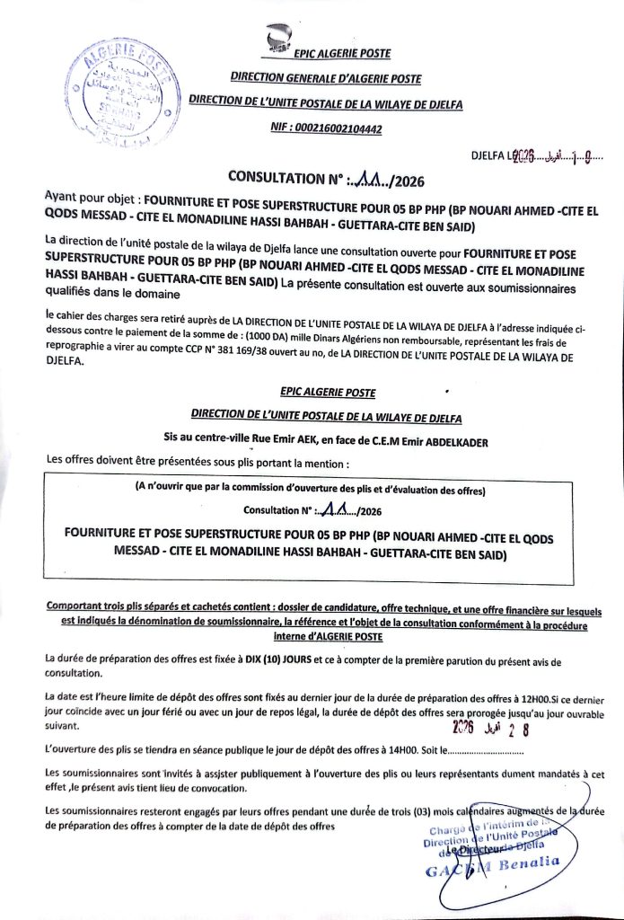 اعلان عن استشارة رقم 11 /2026 لمديرية وحدة بريد الجزائر لولاية الجلفة