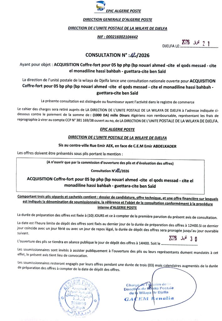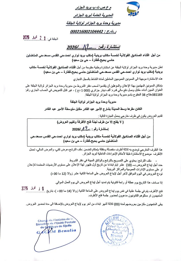 اعلان عن استشارة رقم 12 /2026 لمديرية وحدة بريد الجزائر لولاية الجلفة