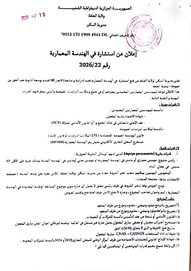 اعلان عن استشارة رقم 22 /2026 لمديرية السكن لولاية الجلفة