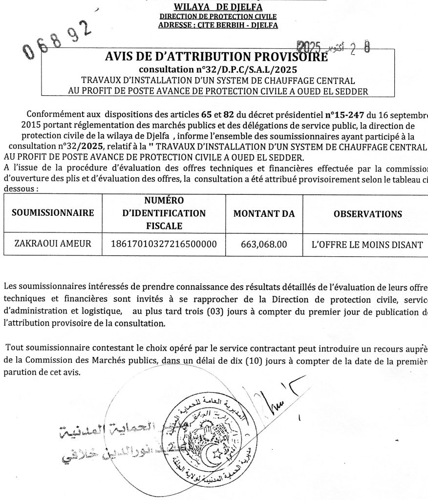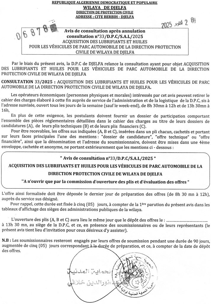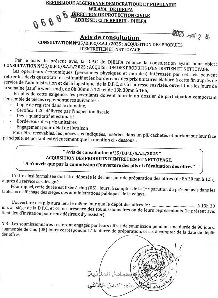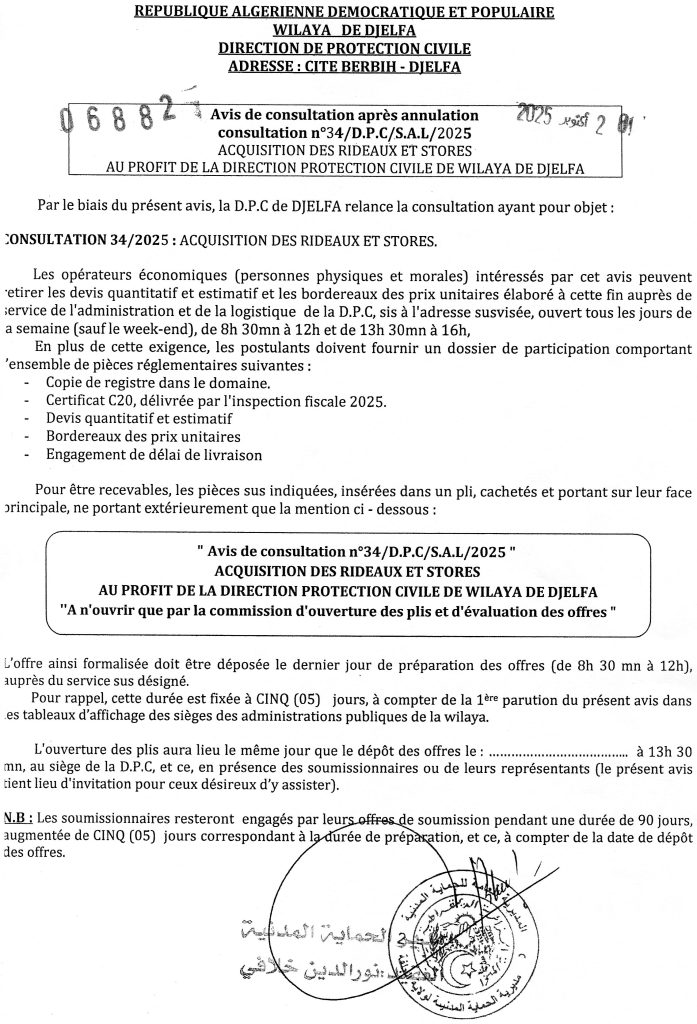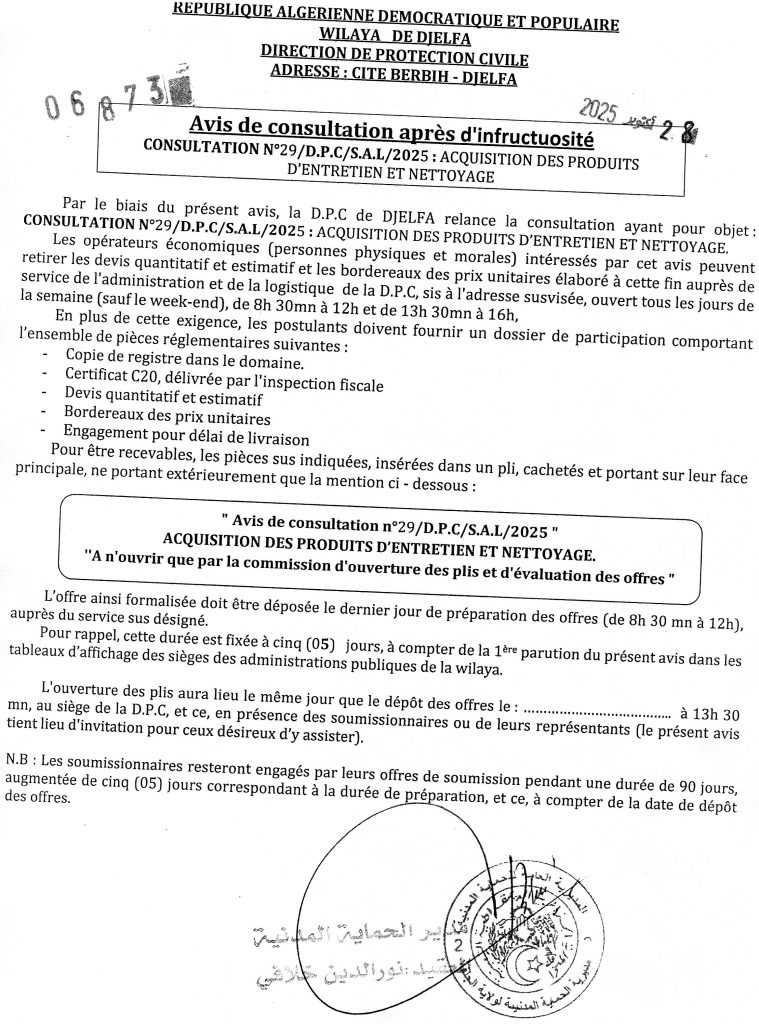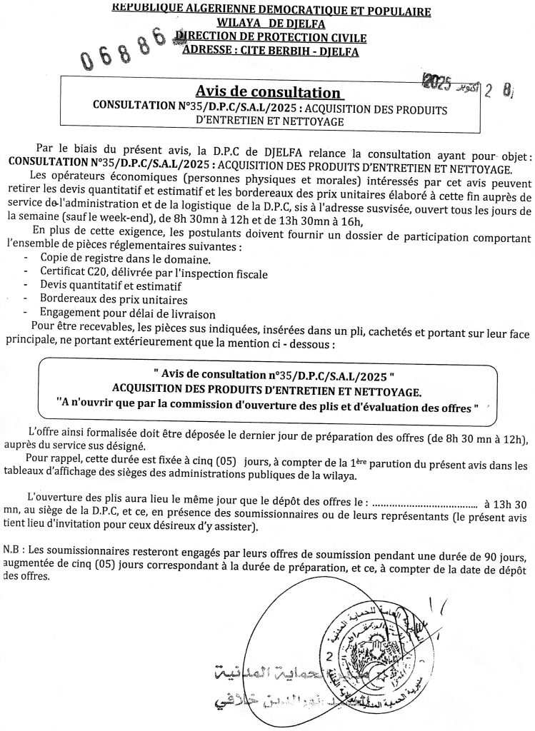 اعلان عن استشارة رقم 29/32/33/34/35 لفائدة مديرية الحماية المدنية