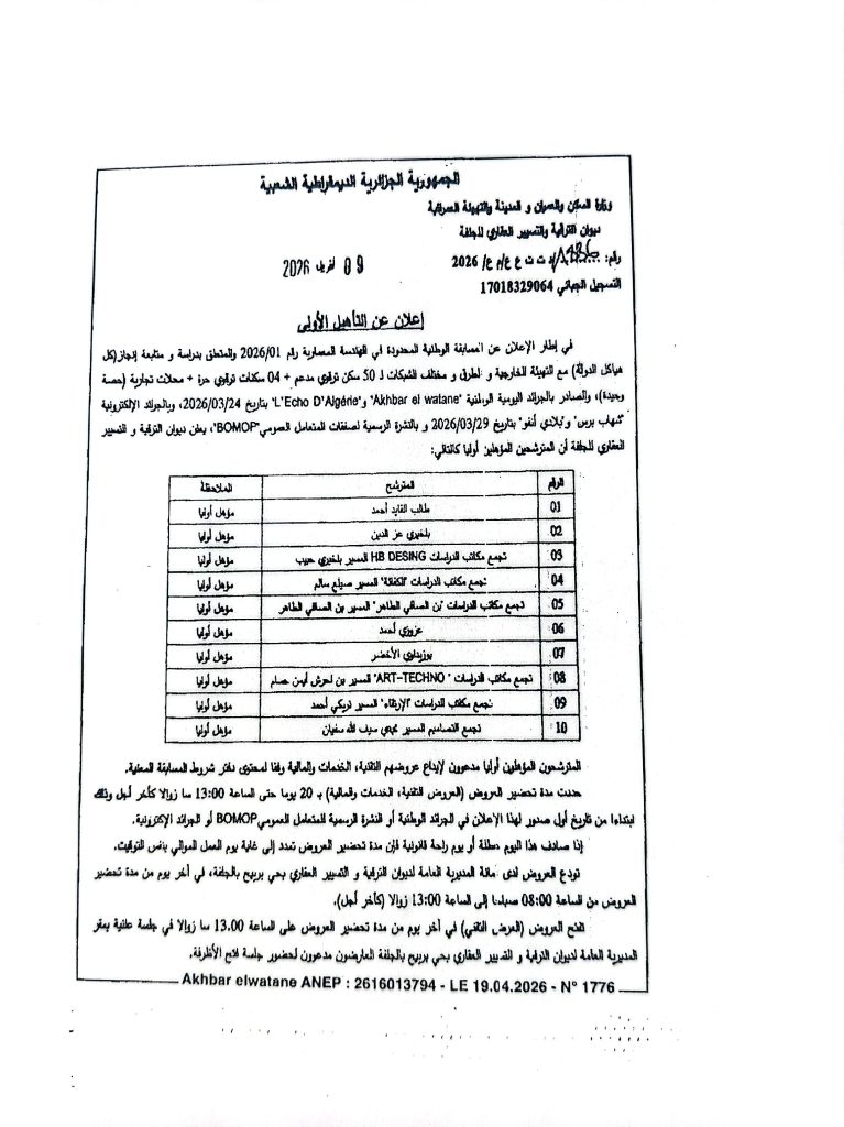 اعلان عن التأهيل الاولي للمسابقة الوطنية في الهندسة المعمارية لديوان الترقيةوالتسيير العقاري لولاية الجلفة