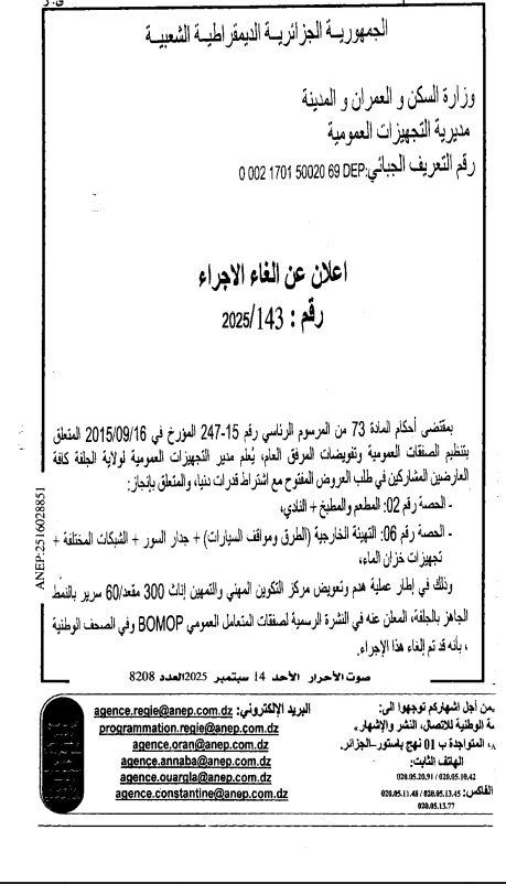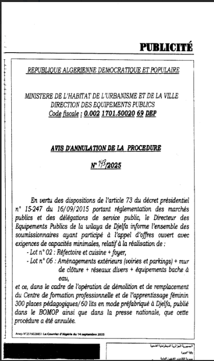 اعلان عن الغاء اجراءات رقم 143/2025 المتعلق بانجاز حصتين النادي و التهيئة الخارجية لفائدة مديرية التجهيزات العمومية