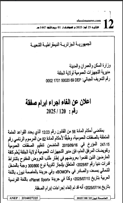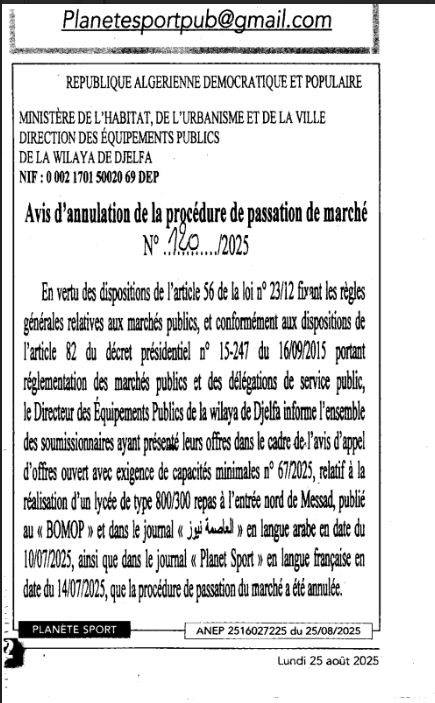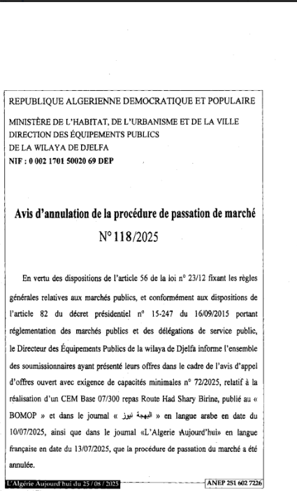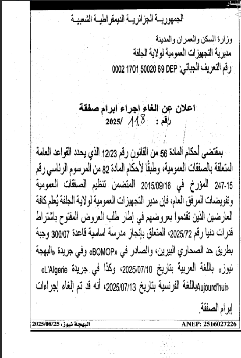 اعلان عن الغاء اجراءات صفقة المتعلقة بانجاز مدرسة اساسية 07/300رقم 118/-25 طريق حد الصحاري البيرين و 120-25 ثانوية نمط 800/300 بالمدخل الشمالي مسعد صاحب المشروع مديرية التجهيزات العمومية.