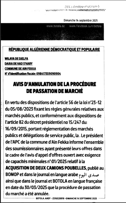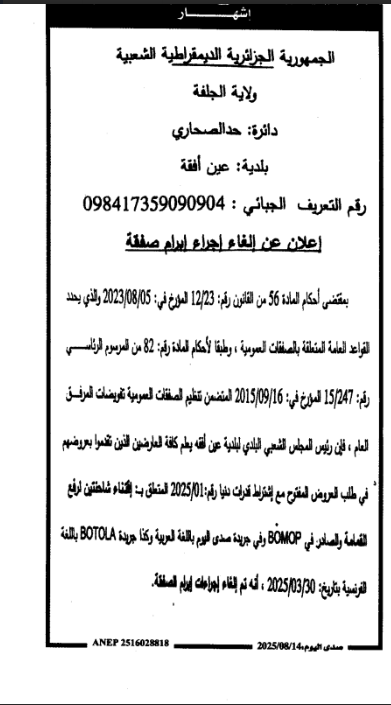 اعلان عن الغاء اجراءات صفقة رقم 01/25 و المتعلقة باقتناء 02 شاحنة القمامة لفائدة بلدية عين فقه
