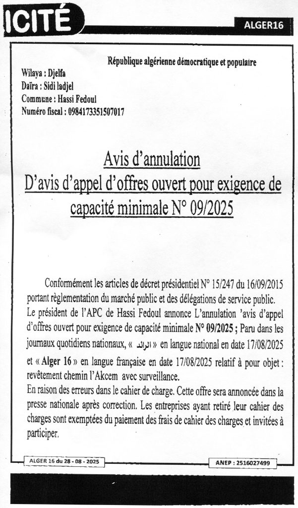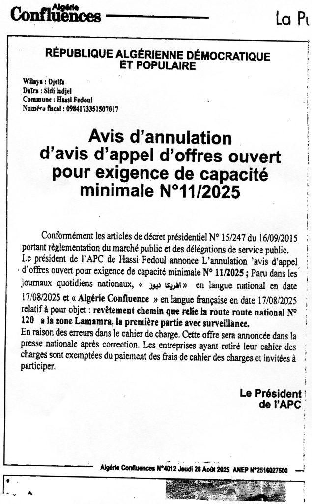 اعلان عن الغاء اجراءات طلب عروض 09+11 -2025 مشروع تعبيد مسالك القسام و الطريق رقم 120-بمنطقة لعمامرة