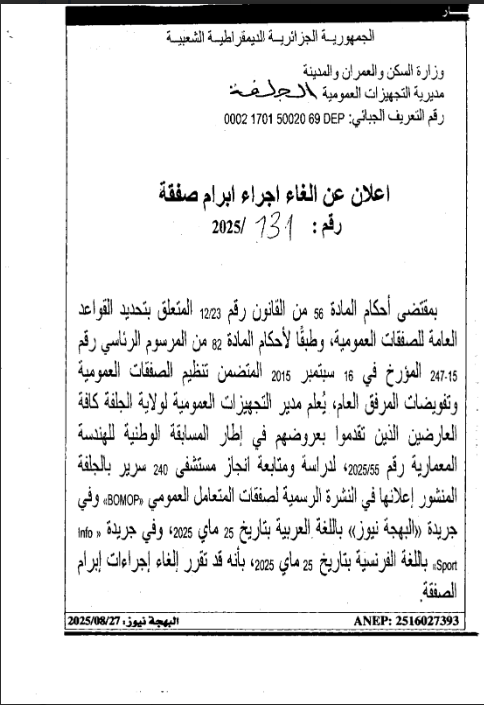 اعلان عن الغاء اجراء الصفقة الخاصة بدراسة و متابعة لانجاز مستشفى 240 سرير بالجلفة لفائدة مديرية التجهيزات العمومية