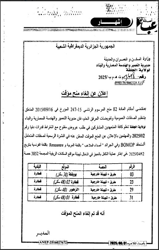 اعلان عن الغاء المنح المؤقت المتعلق بـالتكفل بالعجز في أشغال تهيئة مواقع السكنات الريفيةالمجمعة 3852 حصة لفائدة مديرية التعمير و الهندسة المعمارية و البناء