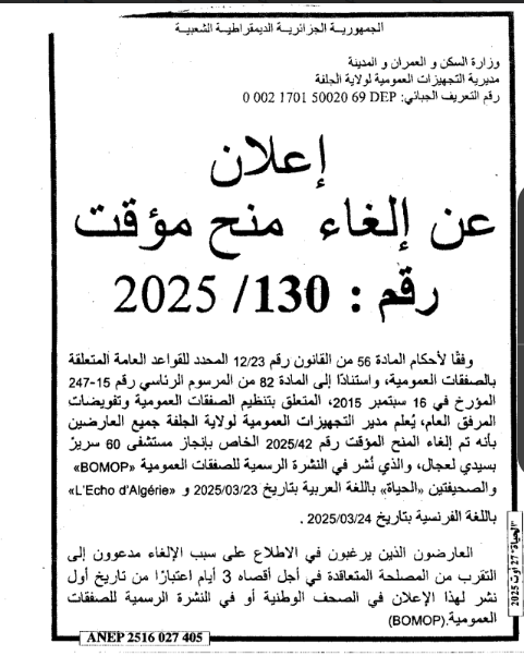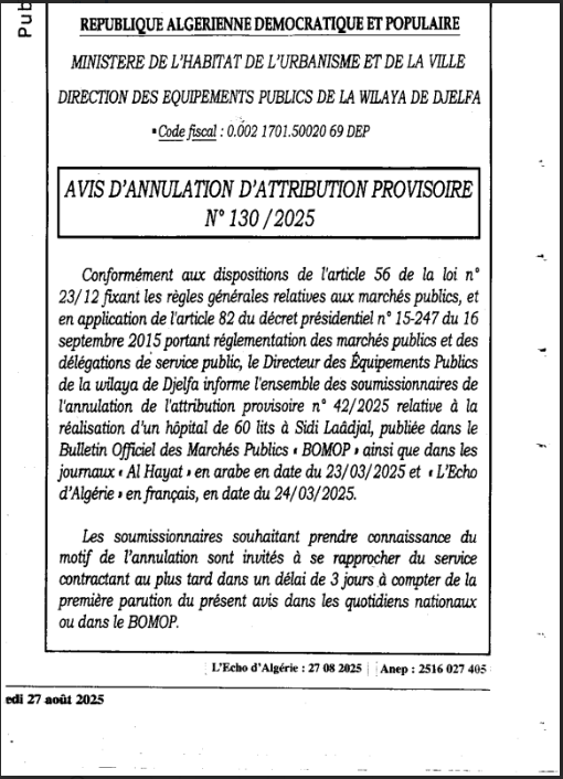 اعلان عن الغاء المنح المؤقت المتعلق بمستشفى 60 سرير بسيدي لعجال صاحب المشروع مديرية التجهيزات العمومية