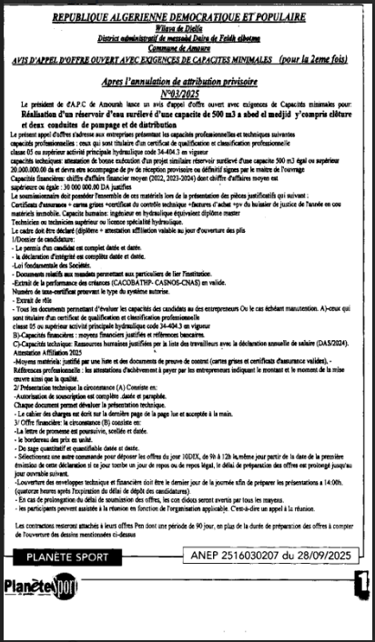 2. جبران تريكس على إعلان عن طلب عروض رقم 09/2025 لاقتناء شاحنات واستشارات رقم 59/60/61 +منح مؤقت لمديرية الادارة المحلية لولاية الجلفة