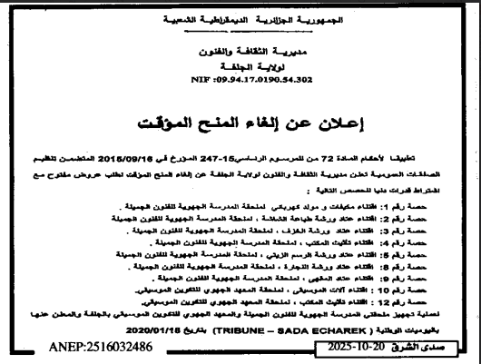 اعلان عن الغاء المنح المؤقت لفائدة مديرية الثقافة و الفنون