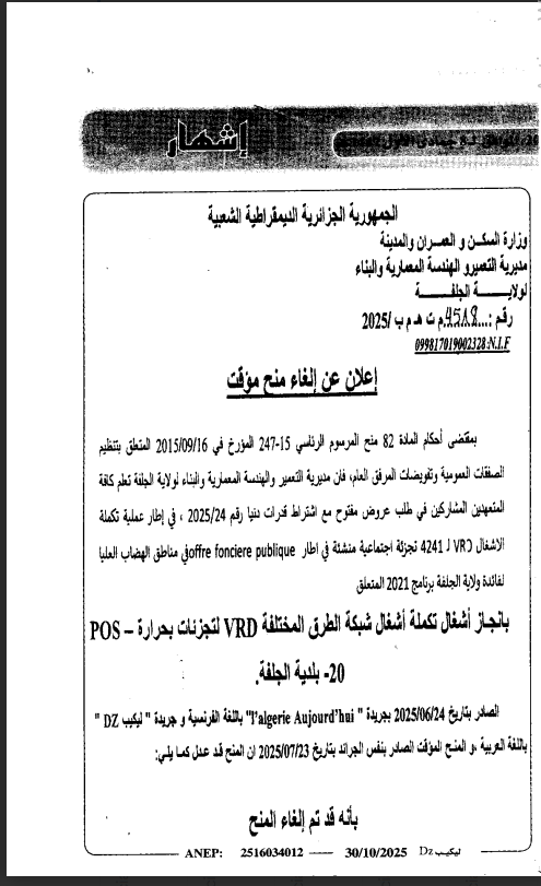 اعلان عن الغاء المنح المؤقت لفائدة مديرية التعمير و الهندسة المعمارية و البناء