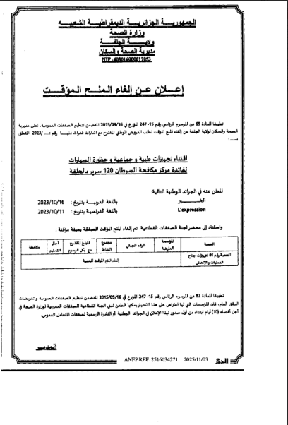 اعلان عن الغاء المنح المؤقت لفائدة مديرية الصحة و السكان