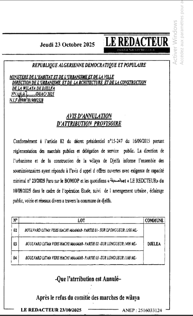 2. جبران تريكس على إعلان عن طلب عروض رقم 09/2025 لاقتناء شاحنات واستشارات رقم 59/60/61 +منح مؤقت لمديرية الادارة المحلية لولاية الجلفة