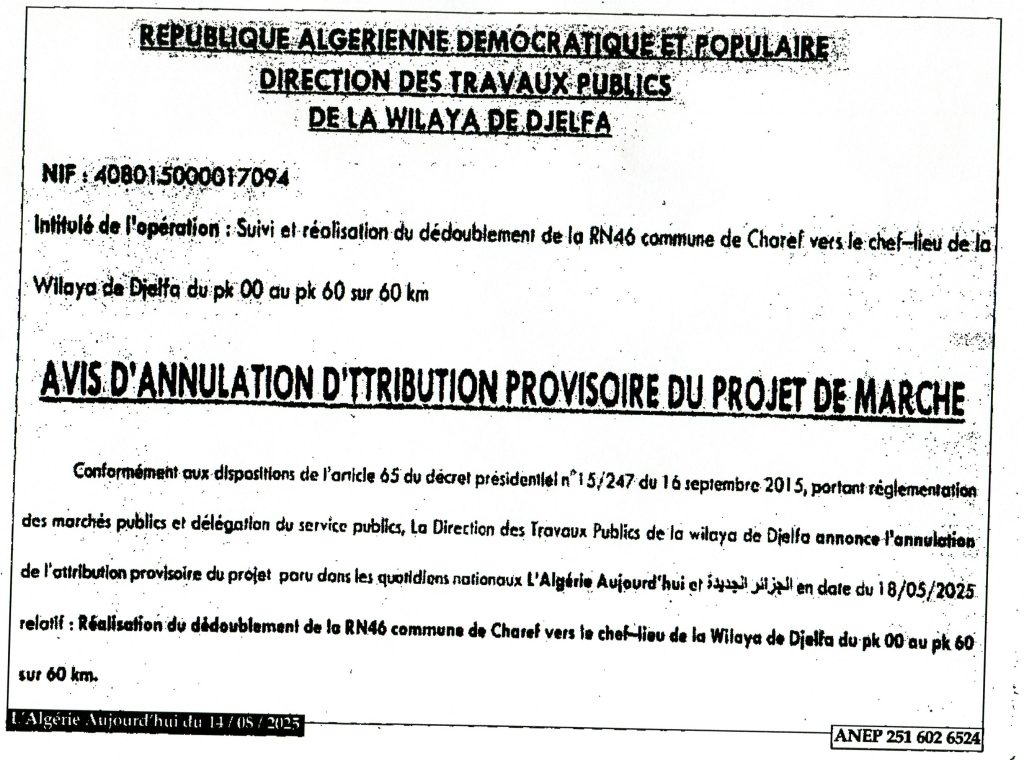 اعلان عن المنح المؤقت رقم 31/33/34/35/36/37/38/ 39/ 2026 لمديرية التجهيزات العمومية لولاية الجلفة