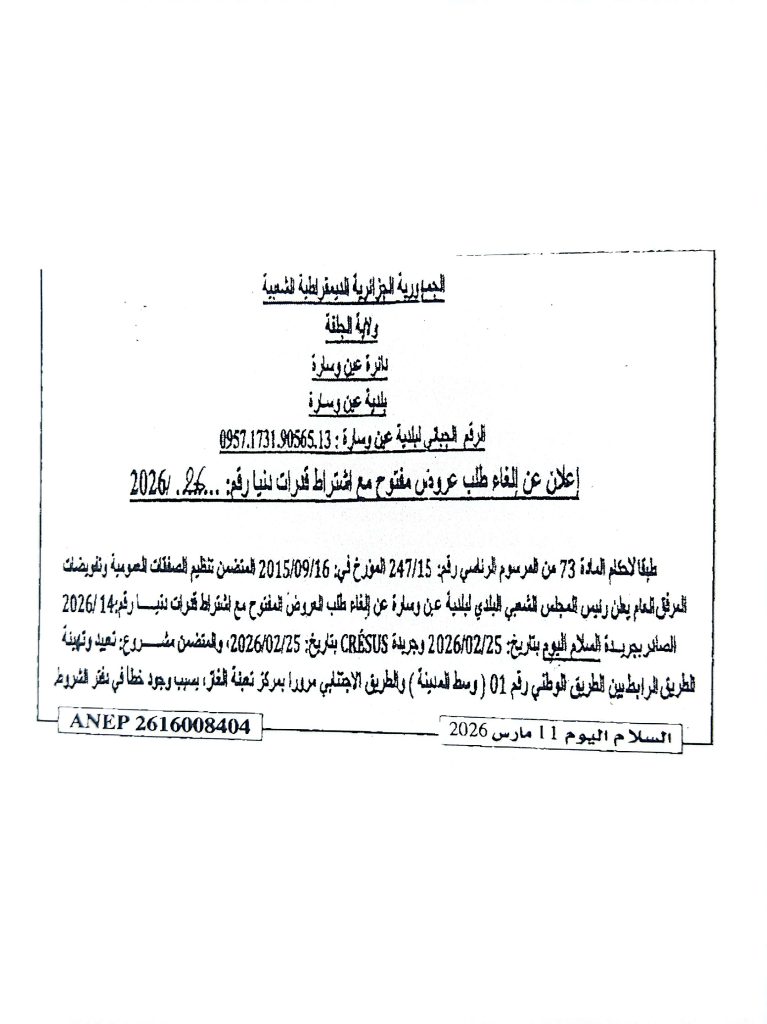 اعلان عن الغاء طلب عروض رقم 26/2026 لبلدية عين وسارة