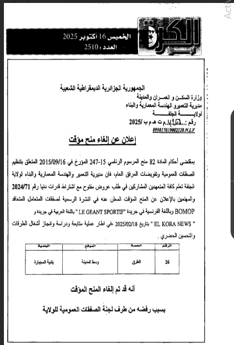 آخر الإعلانات:اعلان عن استشارة رقم 10 /2026 للمؤسسة العمومية الاستشفائية الام والطفل بالجلفةاعلان عن الغاء استشارة رقم 09 /2026 للمؤسسة العمومية الاستشفائية الام والطفل بالجلفةاعلان عن المنح المؤقت للاستشارة رقم 06 / 2026 لمديرية الحماية المدنية لولاية الجلفةاعلان عن المنح المؤقت رقم 05/04/03 / 2026 لمديرية الحماية المدنية لولاية الجلفةاعلان عن الغاء استشارة رقم 59 /2026 لبلدية عين وسارةاعلان عن استشارات رقم 58/60 /2026 لبلدية عين وسارةاعلان عن التأهيل في المسابقة الوطنية المحدودة في الهندسة المعمارية لمديرية التعمير لولاية الجلفةاعلان عن المنح المؤقت لطلب العروض رقم 06 /2026 لبلدية الجلفةاعلان عن منح مؤقت رقم 29/30/31/34 /2026 لمديرية التجهيزات العمومية لولاية الجلفةاعلان عن طلب عروض رقم 63 /2026 لمديرية التجهيزات العمومية لولاية الجلفةاعلان عن طلب عروض رقم 06/05 /2026 لبلدية دار الشيوخاعلان عن المنح المؤقت لبلدية الشارفاعذار ثاني من مديرية السكن لولاية الجلفة موجه لمؤسسة برادعي محمداعذار ثاني من مديرية التعمير لولاية الجلفة موجه لمؤسسة ذياب سعداعلان عن المنح المؤقت لطلب العروض لمديرية التجهيزات العمومية لولاية الجلفةاعلان عن التأهيل الاولي للمسابقة الوطنية في الهندسة المعمارية لديوان الترقيةوالتسيير العقاري لولاية الجلفةاعلان عن عدم جدوى طلب العروض لمديرية الشباب والرياضة لولاية الجلفةاعلان عن تصحيح المنح المؤقت رقم 01 /2026 للمؤسسة العمومية الاستشفائية بحاسي بحبحاعلان عن المنح المؤقت لبلدية دار الشيوخاعلان عن الغاء استشارات رقم 16/15/14/13 /2026 لمديرية التربية لولاية الجلفةاعلان عن الغاء استشارات رقم 12/11/10/09 /2026 لمديرية التربية لولاية الجلفةاعلان عن الغاء استشارات رقم 08/07/06/05 /2026 لمديرية التربية لولاية الجلفةاعلان عن الغاء استشارات رقم 04/03/02/01 /2026 لمديرية التربية لولاية الجلفةاعلان عن استشارة رقم 11 /2026 لمديرية وحدة بريد الجزائر لولاية الجلفةاعلان عن المنح المؤقت للاستشارة رقم 12 /2026 لديوان الترقيةوالتسيير العقاري لولاية الجلفةاعذار رقم 02 من طرف مديرية السكن لولاية الجلفة موجه لمؤسسة برادعي محمداعذار اول من طرف مديرية الثقافة لولاية الجلفة موجه لتجمع الازدهاراعلان عن المنح المؤقت لطلب العروض رقم 06/ 2026 لبلدية الجلفةاعلان عن الغاء المنح المؤقت لطلب العروض رقم 05/2026 لبلدية سد رحالاعلان عن عدم جدوى طلب العروض لمديرية الشباب والرياضة لولايةالجلفةاعلان عن المنح المؤقت لمديرية الشباب والرياضة لولايةالجلفةاعلان عن المنح المؤقت لطلب العروض رقم 38/ 2026 لمديرية التجهيزات العمومية لولايةالجلفةاعلان عن الغاء المنح المؤقت لطلب العروض رقم 19/2026 لمديرية التعمير والهندسة المعمارية والبناء لولايةالجلفةاعلان عن طلب عروض رقم 05/ 2026 لبلدية الجلفةاعلان عن طلب عروض رقم 03/ 2026 لمديرية الشباب والرياضة لولاية الجلفةاعلان عن طلب عروض رقم 13/12/ 2026 لمديرية التعمير والهندسة المعمارية والبناء لولاية الجلفةاعلان عن استشارة رقم 10 /2026 لمديرية وحدة بريد الجزائر لولاية الجلفةاعلان عن عدم جدوى الاستشارة رقم 11 /2026 لديوان الترقيةوالتسيير العقاري لولاية الجلفةاعلان عن إستشارات رقم 65/55/54 /2026 لبلدية عين وسارةاعذار رقم 01 من مصالح بلدية عين وسارة موجه لمؤسسة برادعي محمداعلان عن المنح المؤقت لطلب العروض رقم 17/2026 للمؤسسة العمومية الاستشفائية عين وسارةاعلان عن تصحيح المنح المؤقت لطلب العروض رقم 02/2026 لمديرية السكن لولاية الجلفةاعلان عن المنح المؤقت لطلبات العروض رقم 03/01 /2026 لمديرية السكن لولاية الجلفةاعلان عن الغاء المنح المؤقت لطلب العروض رقم 19/2026 لمديرية التعمير والهندسة المعمارية والبناء لولاية الجلفةاعلان عن طلب عروض رقم 08 /2026 لبلدية سد رحالاعلان عن طلب عروض رقم 13 /2026 لمديرية التعمير والهندسة المعمارية والبناء لولاية الجلفةاعلان عن المنح المؤقت للاستشارة رقم 09 /2026 لبلدية عين افقهاعلان عن المنح المؤقت لبلدية مسعدمنح 