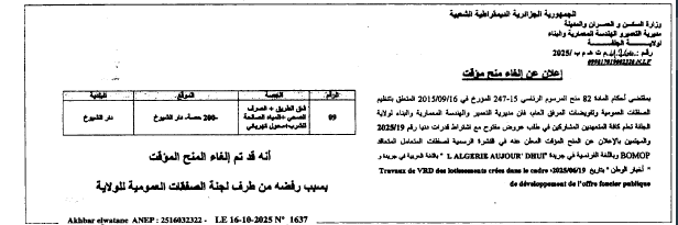 اعلان عن الغاء عن المنح المؤقت لفائدة مديرية التعمير و الهندسة و المعمارية و البناء