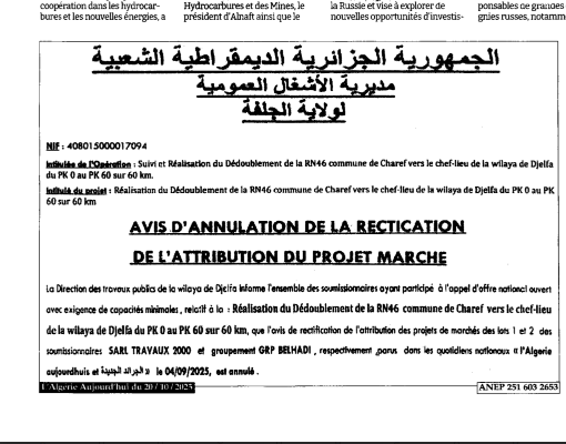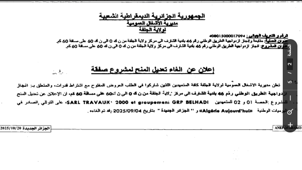اعلان عن الغاء تعديل منح مؤقت لفائدة مديرية الاشغال العمومية