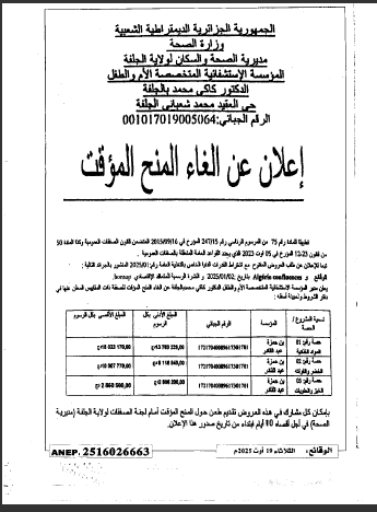 • اعلان عن المنح المؤقت رقم 31/33/34/35/36/37/38/ 39/ 2026 لمديرية التجهيزات العمومية لولاية الجلفة